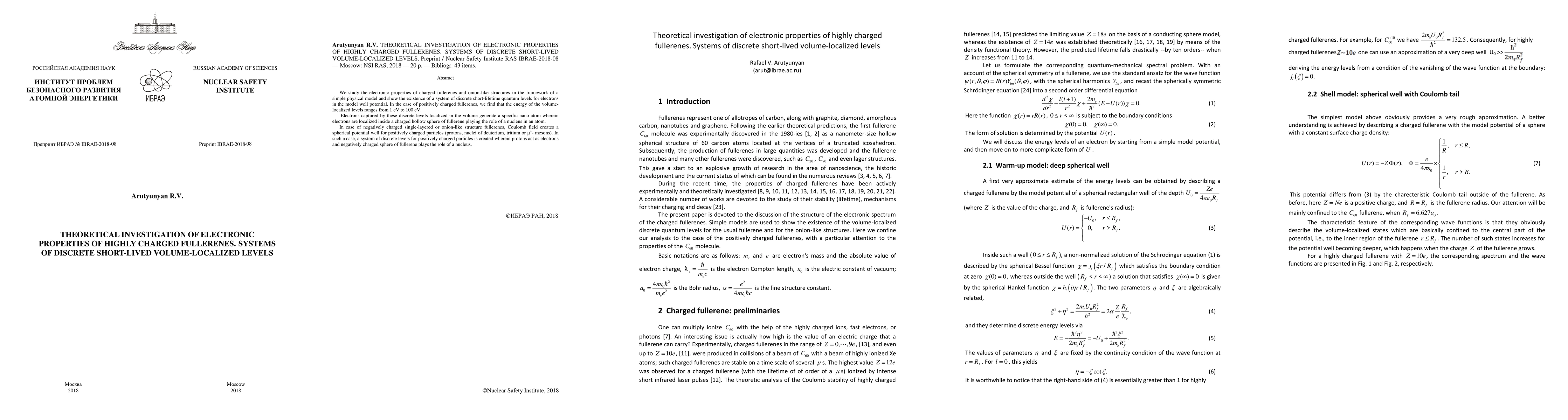 This research investigates the electronic properties of highly charged fullerenes and onion-like structures, revealing discrete short-lived quantum levels within the volume-localized potential. For positively charged fullerenes, these levels range from 1 eV to 100 eV, forming a specific nano-atom configuration.