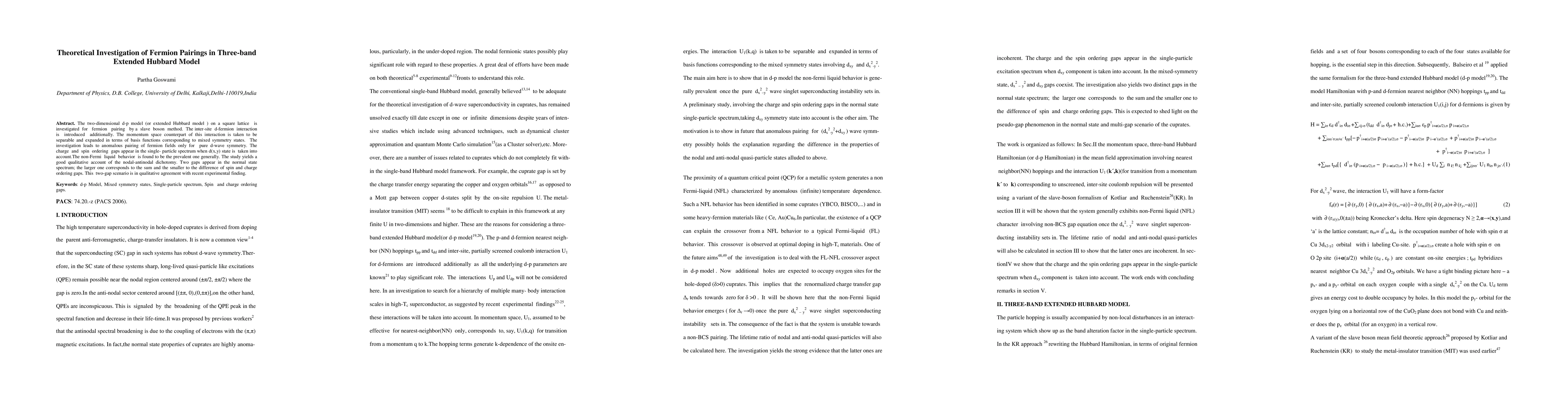 The two-dimensional d-p model (or extended Hubbard model) on a square lattice is investigated for fermion pairing by a slave boson method. The inter-site d-fermion interaction is introduced additionally. The momentum space counterpart of this interaction is taken to be separable and expanded in terms of basis functions corresponding to mixed symmetry states. The investigation leads to anomalous pairing of fermion fields only for pure d-wave symmetry. The charge and spin ordering gaps appear in the single- particle spectrum when d(x,y) state is taken into account.The non-Fermi liquid behavior is found to be the prevalent one generally. The study yields a good qualitative account of the nodal-antinodal dichotomy. Two gaps appear in the normal state spectrum; the larger one corresponds to the sum and the smaller to the difference of spin and charge ordering gaps. This two-gap scenario is in qualitative agreement with recent experimental finding.