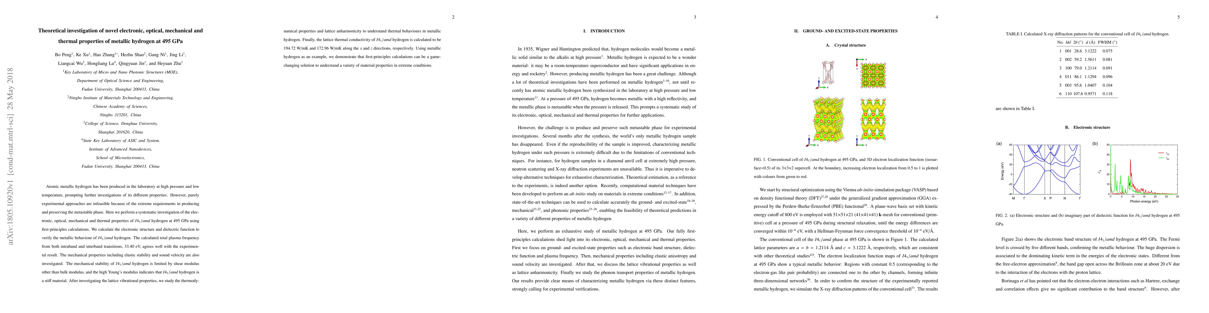 Researchers investigate metallic hydrogen at 495 GPa using first-principles calculations, revealing its electronic, optical, mechanical, and thermal properties, including a high Young's modulus and lattice thermal conductivity of 194.72 W/mK.
