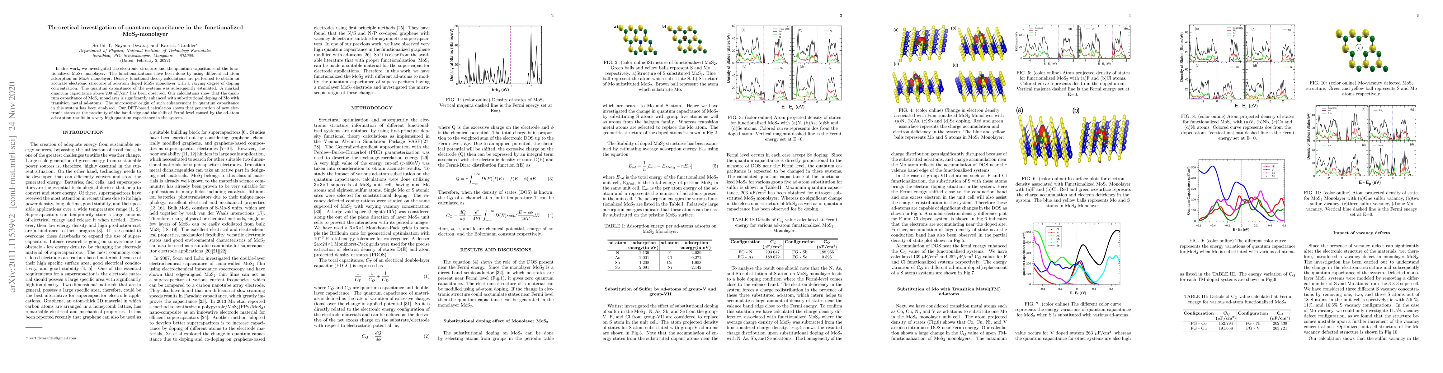In this work, we investigated the electronic structure and the quantum capacitance of the functionalized MoS$_2$ monolayer. The functionalizations have been done by using different ad-atom adsorption on Mo$S_2$ monolayer. Density functional theory calculations are performed to obtain an accurate electronic structure of ad-atom doped MoS$_2$ monolayer with a varying degree of doping concentration. The quantum capacitance of the systems was subsequently estimated. A marked quantum capacitance above 200 $\mu$F/cm$^2$ has been observed. Our calculations show that the quantum capacitance of MoS$_2$ monolayer is significantly enhanced with substitutional doping of Mo with transition metal ad-atoms. The microscopic origin of such enhancement in quantum capacitance in this system has been analyzed. Our DFT-based calculation shows that generation of new electronic states at the proximity of the band-edge and the shift of Fermi level caused by the ad-atom adsorption results in a very high quantum capacitance in the system.