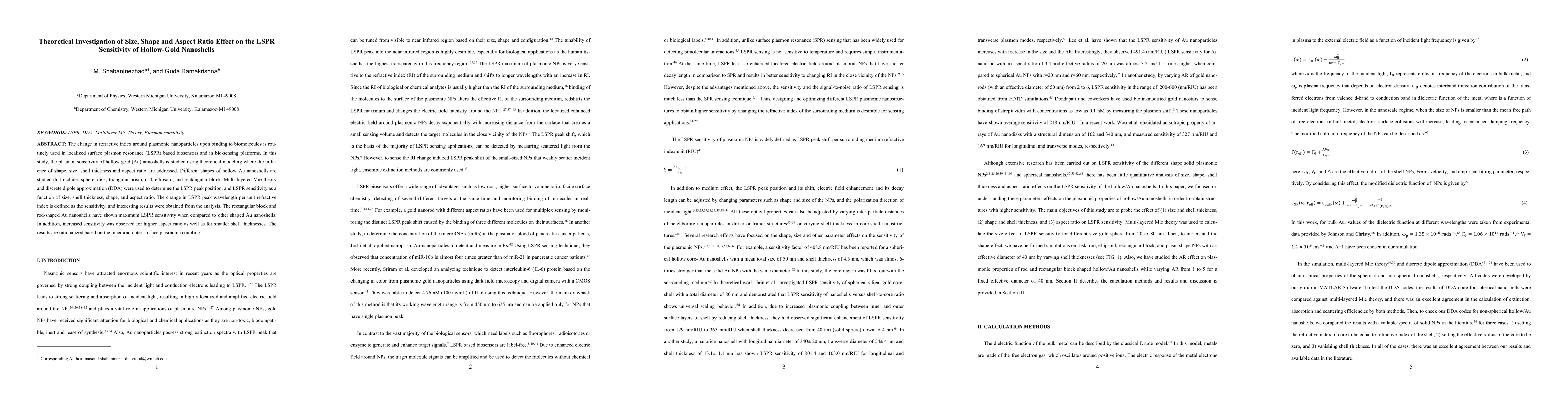 This study investigates the localized surface plasmon resonance (LSPR) sensitivity of various hollow gold nanoshell shapes using theoretical modeling. The analysis reveals that rectangular block and rod-shaped nanoshells exhibit maximum LSPR sensitivity, with higher sensitivity observed for higher aspect ratios and smaller shell thicknesses due to enhanced inner and outer surface plasmonic coupling.