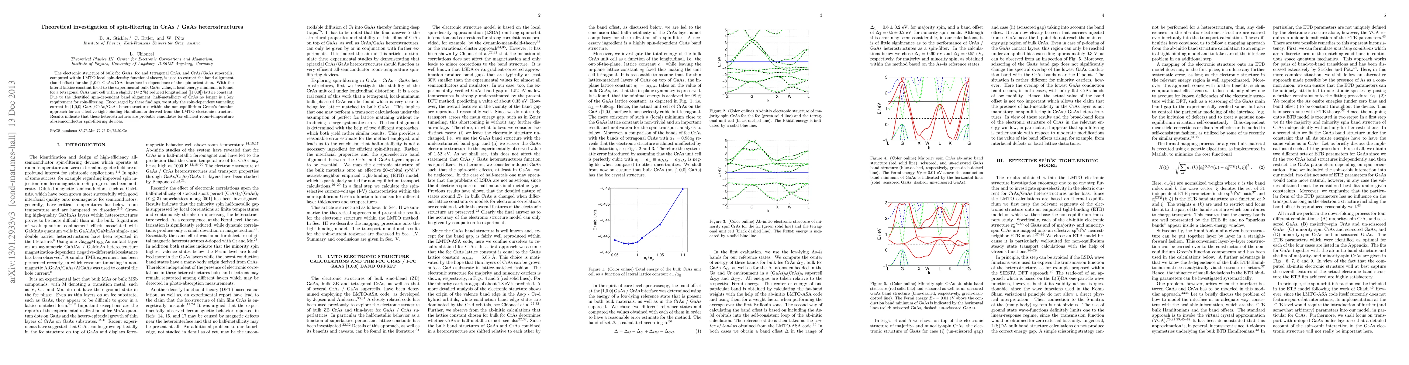 The electronic structure of bulk fcc GaAs, fcc and tetragonal CrAs, and CrAs/GaAs supercells, computed within LMTO local spin-density functional theory, is used to extract the band alignment (band offset) for the [1,0,0] GaAs/CrAs interface in dependence of the spin orientation. With the lateral lattice constant fixed to the experimental bulk GaAs value, a local energy minimum is found for a tetragonal CrAs unit cell with a slightly ($\approx$ 2%) reduced longitudinal ([1,0,0]) lattice constant. Due to the identified spin-dependent band alignment, half-metallicity of CrAs no longer is a key requirement for spin-filtering. Encouraged by these findings, we study the spin-dependent tunneling current in [1,0,0] GaAs/CrAs/GaAs heterostructures within the non-equilibrium Green's function approach for an effective tight-binding Hamiltonian derived from the LMTO electronic structure. Results indicate that these heterostructures are probable candidates for efficient room-temperature all-semiconductor spin-filtering devices.