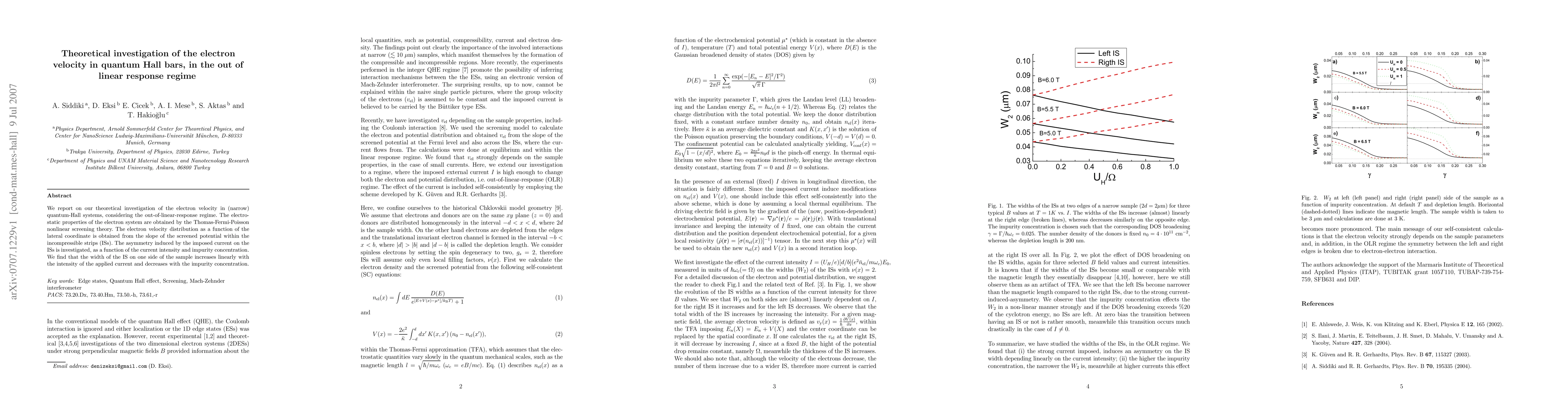 This paper investigates electron velocity in quantum Hall bars beyond linear response, using Thomas-Fermi-Poisson theory to model electrostatic properties. The study finds that the width of incompressible strips asymmetrically adjusts with current intensity and impurity concentration.