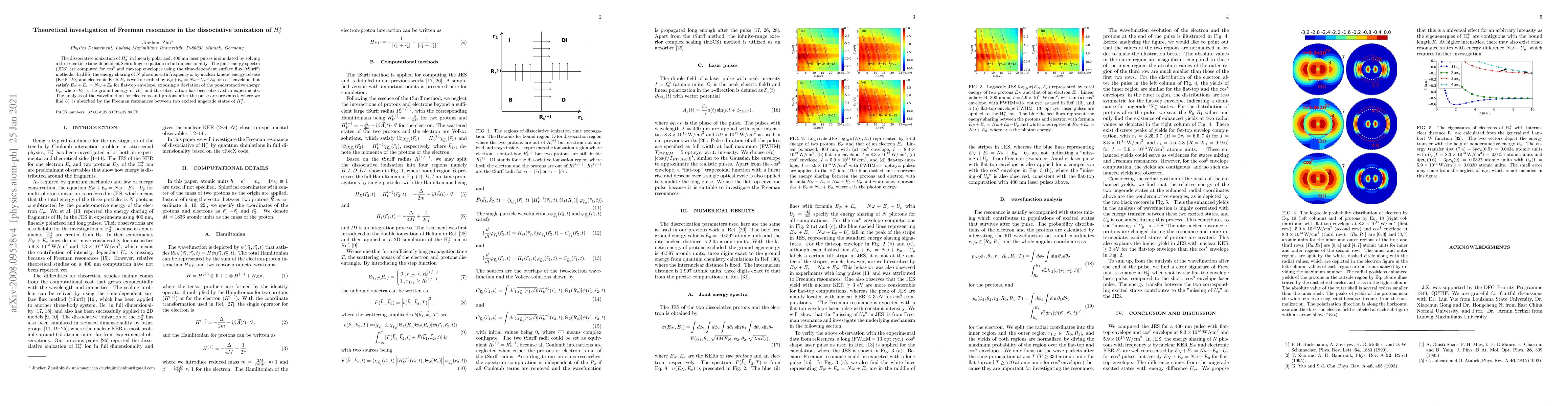 The dissociative ionization of $H_2^+$ in linearly polarized, 400 nm laser pulses is simulated by solving a three-particle time-dependent Schr\"odinger equation in full dimensionality. The joint energy spectra (JES) are computed for $\cos^8$ and flat-top envelopes using the time-dependent surface flux (tSurff) methods. In JES, the energy sharing $n$ photon energies $\omega$ of nuclear kinetic energy release (KER) $E_N$ and electronic KER $E_e$ are well represented by $E_N+E_e=n\omega-U_p+E_0$ for $\cos^8$ pulses, but satisfy $E_N+E_e=n\omega+E_0$ for flat-top envelope, exposing a deviation of the ponderomotive energy $U_p$, which has been observed in experiments, where $E_0$ is the ground energy of $H_2^+$. The analysis of the wavefunction for electrons and protons after the pulse are presented, where we find $U_p$ is absorbed by the Freeman resonances between two excited ungerade states.