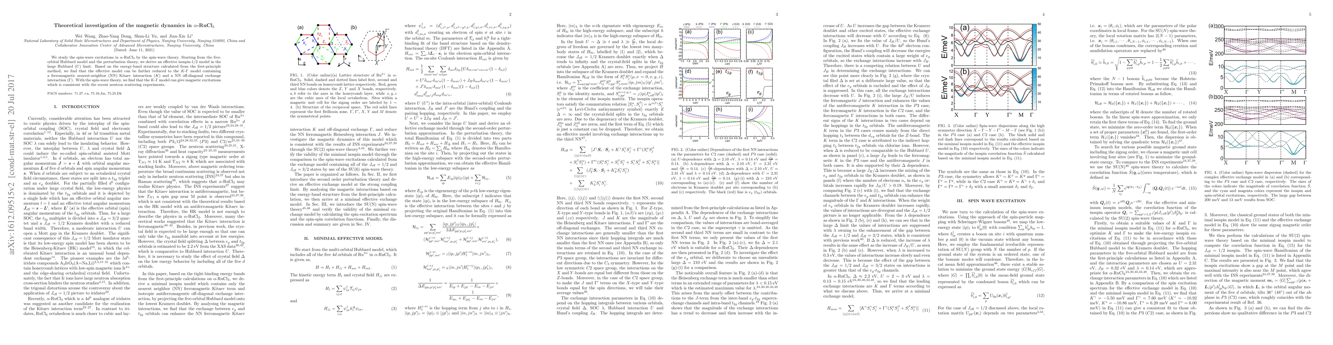 We study the spin-wave excitations in $\alpha$-RuCl$_3$ by the spin-wave theory. Starting from the five-orbital Hubbard model and the perturbation theory, we derive an effective isospin-$1/2$ model in the large Hubbard ($U$) limit. Based on the energy-band structure calculated from the first-principle method, we find that the effective model can be further reduced to the $K$-$\Gamma$ model containing a ferromagnetic nearest-neighbor (NN) Kitaev interaction ($K$) and a NN off-diagonal exchange interaction ($\Gamma$). With the spin-wave theory, we find that the $K$-$\Gamma$ model can give magnetic excitations which is consistent with the recent neutron scattering experiments.