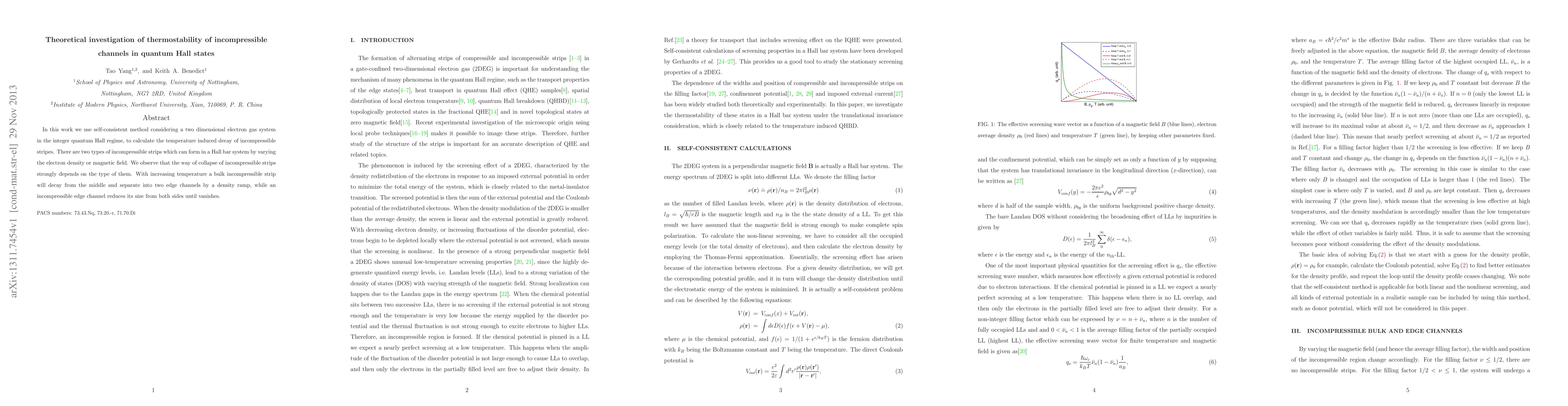 This paper investigates the thermostability of incompressible channels in quantum Hall states using a self-consistent method for two-dimensional electron gas. The study finds that the decay of incompressible stripes varies depending on whether they are bulk or edge channels, with bulk channels splitting into edge channels and edge channels shrinking from both ends with temperature.