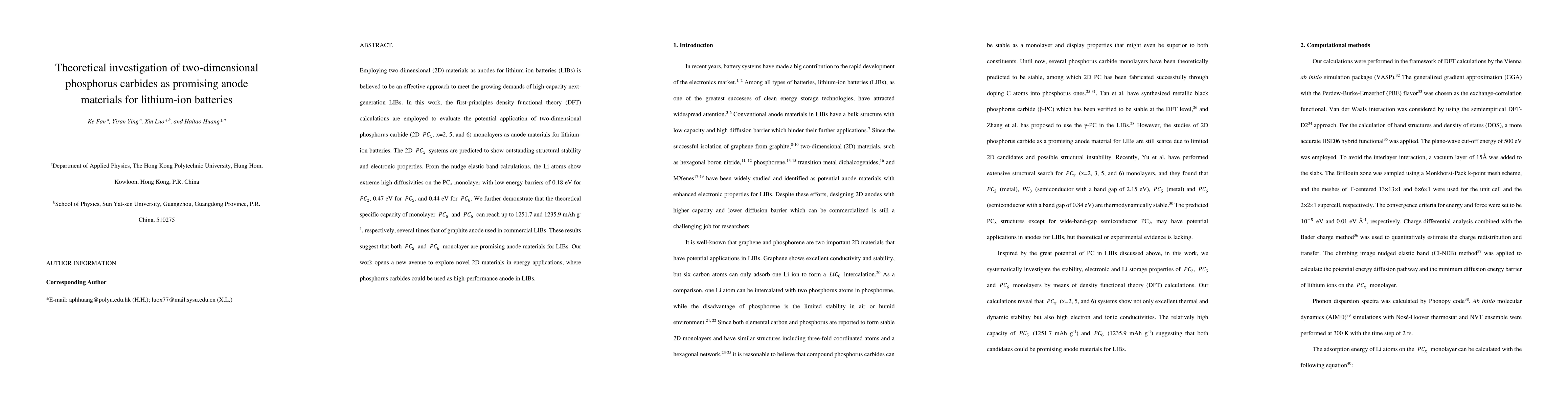 Employing two-dimensional (2D) materials as anodes for lithium-ion batteries (LIBs) is believed to be an effective approach to meet the growing demands of high-capacity next-generation LIBs. In this work, the first-principles density functional theory (DFT) calculations are employed to evaluate the potential application of two-dimensional phosphorus carbide (2D PCx, x=2, 5, and 6) monolayers as anode materials for lithium-ion batteries. The 2D PCx systems are predicted to show outstanding structural stability and electronic properties. From the nudge elastic band calculations, the Li atoms show extreme high diffusivities on the PCx monolayer with low energy barriers of 0.18 eV for PC2, 0.47 eV for PC5, and 0.44 eV for PC6. We further demonstrate that the theoretical specific capacity of monolayer PC5 and PC6 can reach up to 1251.7 and 1235.9 mAh g-1, respectively, several times that of graphite anode used in commercial LIBs. These results suggest that both PC5 and PC6 monolayer are promising anode materials for LIBs. Our work opens a new avenue to explore novel 2D materials in energy applications, where phosphorus carbides could be used as high-performance anode in LIBs.