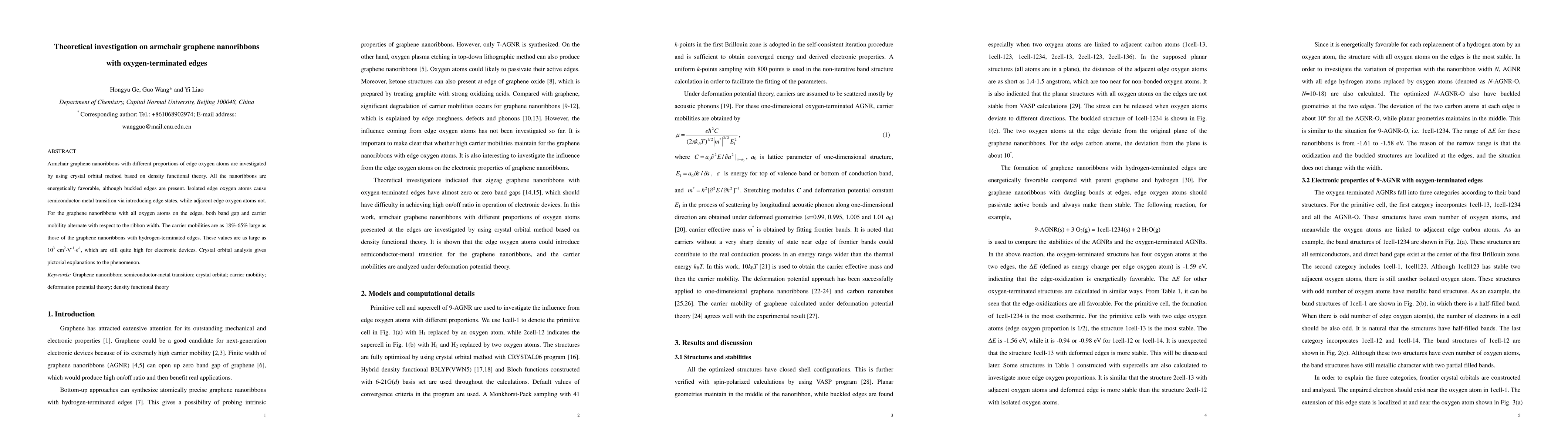 The paper presents a detailed theoretical investigation of armchair graphene nanoribbons with oxygen-terminated edges, providing insights into their stability, electronic band structures, and carrier mobilities using DFT and crystal orbital analysis.