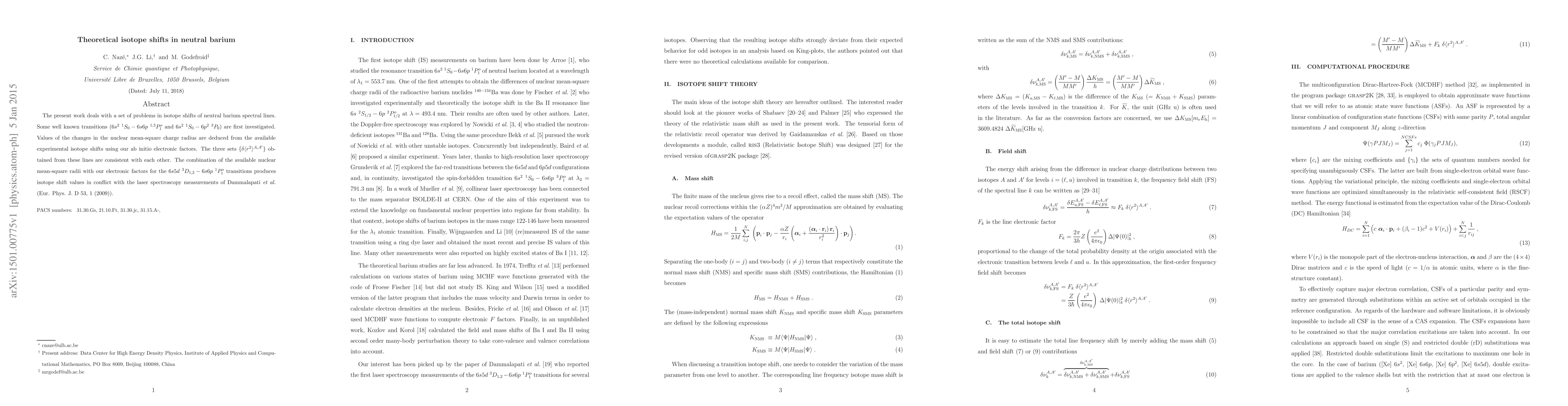 This paper investigates isotope shifts in neutral barium spectral lines, deriving nuclear mean-square charge radius changes from experimental data and ab initio electronic factors. The results for certain transitions are consistent, but discrepancies arise when comparing calculated shifts for other transitions with recent laser spectroscopy measurements.