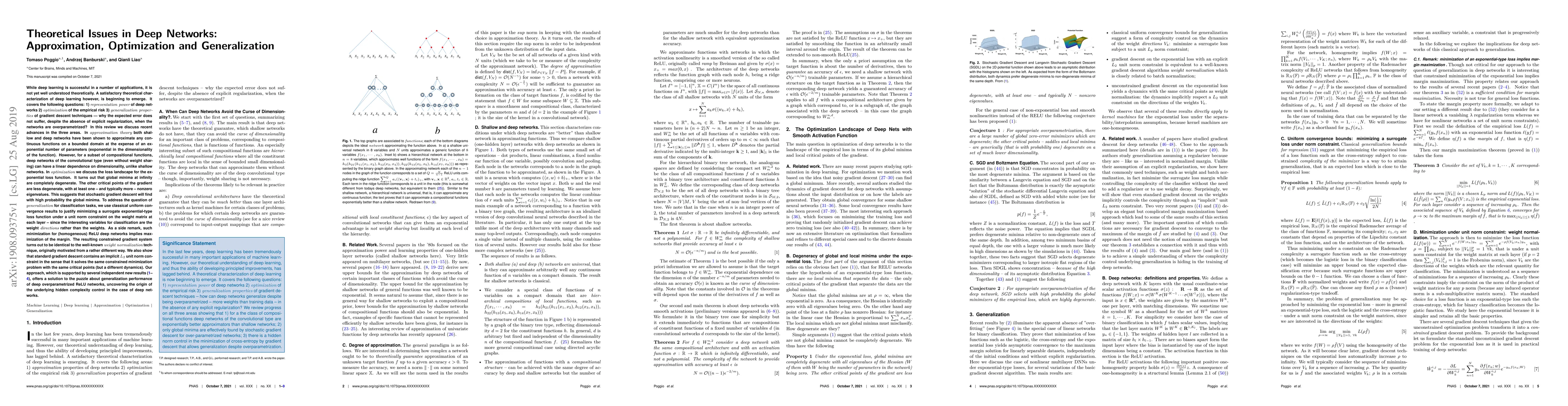 This paper reviews theoretical advances in deep learning, focusing on approximation power, optimization via gradient descent, and generalization properties. It highlights that deep networks can approximate complex functions efficiently and that stochastic gradient descent tends to find global minima. The study also explains the generalization success of overparametrized networks through uniform convergence and weight direction constraints, offering insights into hidden complexity control.