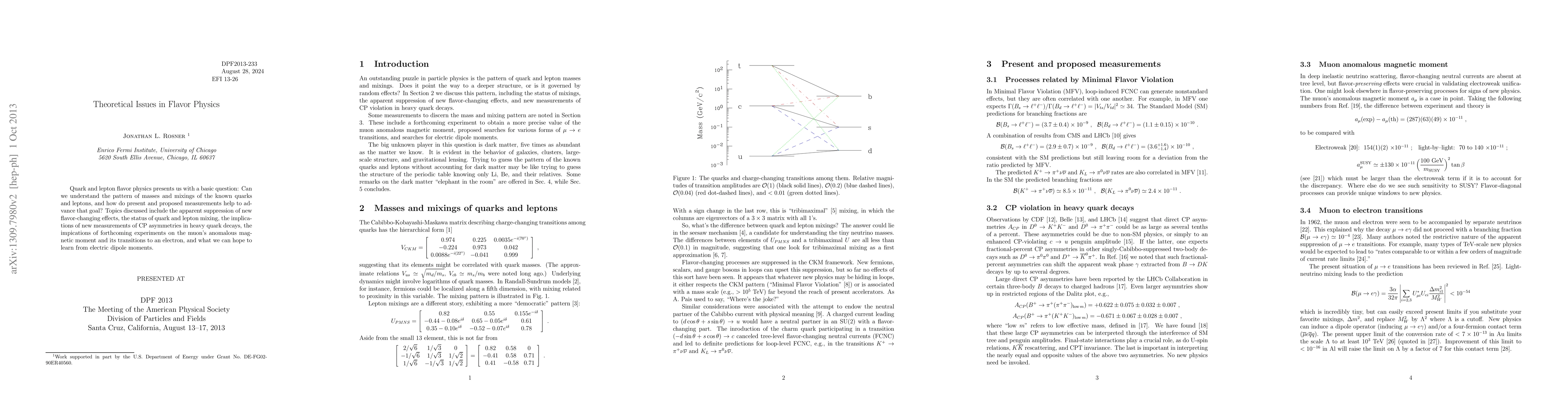 The paper discusses theoretical issues in flavor physics, focusing on understanding quark and lepton mass patterns and mixings through present and proposed measurements.