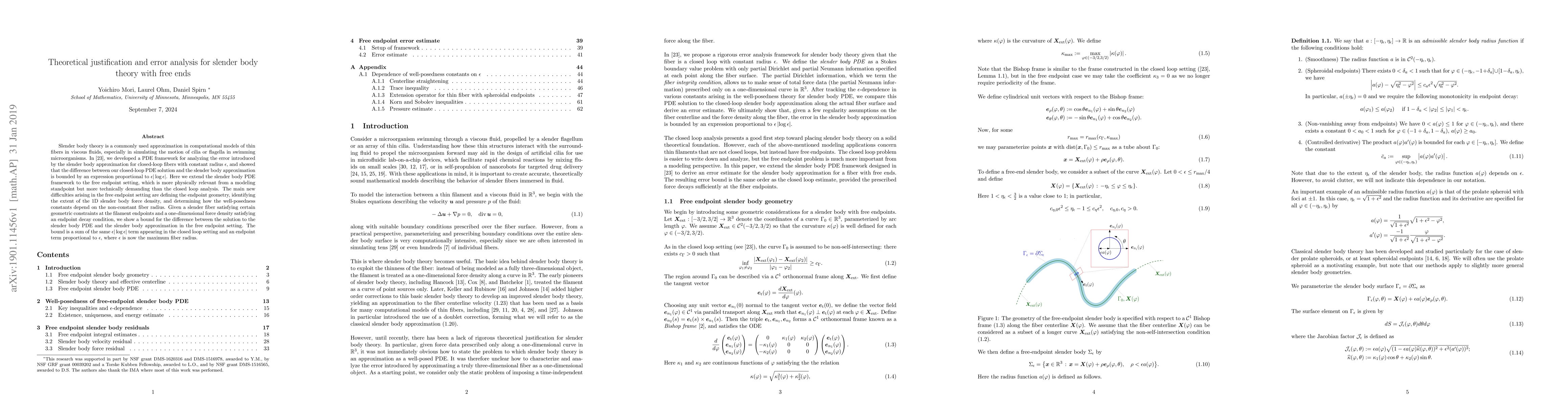 This paper extends slender body theory to free-end fibers in viscous fluids, analyzing the error introduced by the approximation. It provides a bound for the difference between the PDE solution and the approximation, combining the $\epsilon|\log\epsilon|$ term from closed-loop fibers with an additional endpoint term.