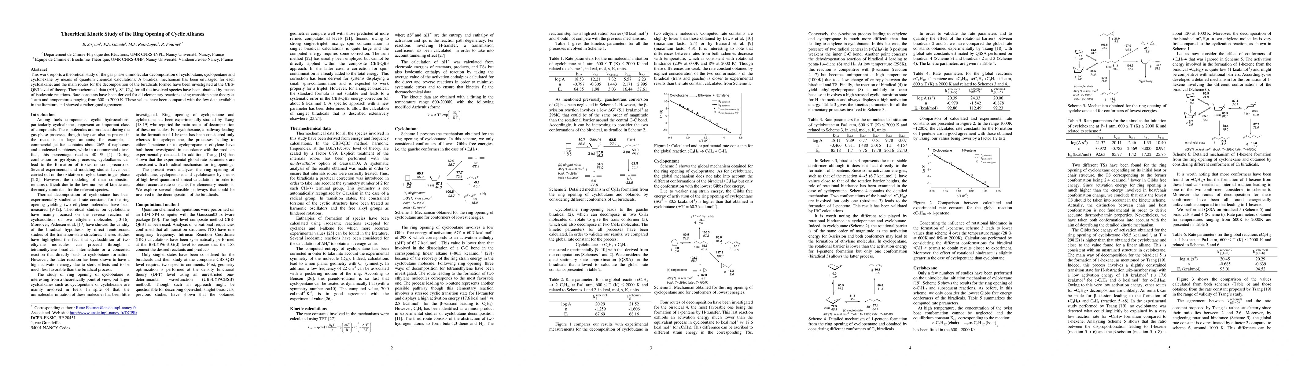 This work reports a theoretical study of the gas phase unimolecular decomposition of cyclobutane, cyclopentane and cyclohexane by means of quantum chemical calculations. A biradical mechanism has been envisaged for each cycloalkane, and the main routes for the decomposition of the biradicals formed have been investigated at the CBS-QB3 level of theory. Thermochemical data (?H\degree f, S\degree, C\degree p) for all the involved species have been obtained by means of isodesmic reactions. Rate constants have been derived for all elementary reactions using transition state theory at 1 atm and temperatures ranging from 600 to 2000 K. These values have been compared with the few data available in the literature and showed a rather good agreement.