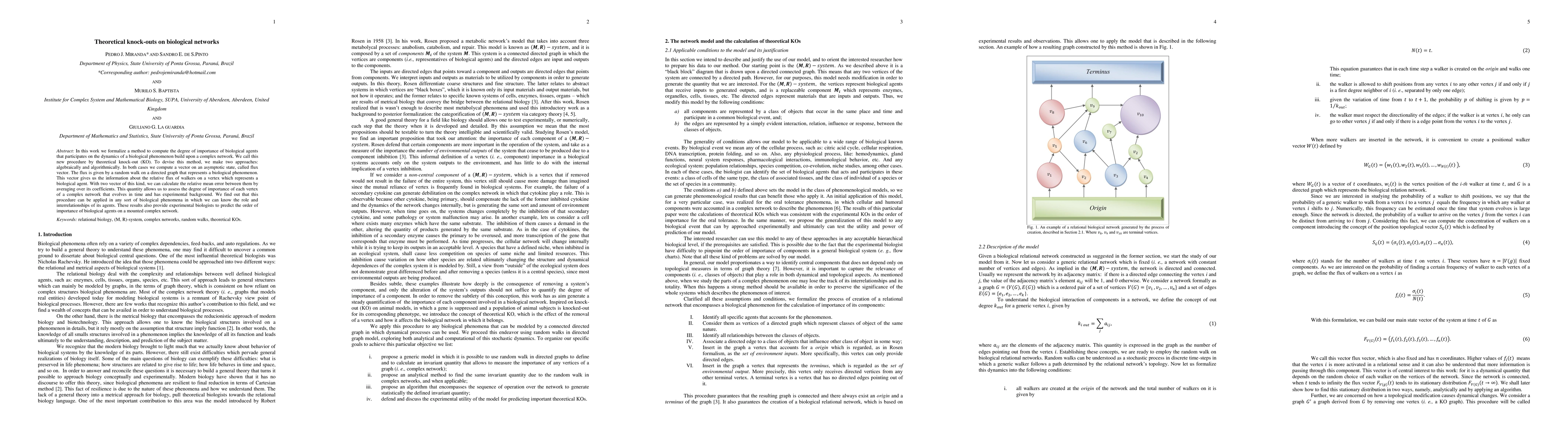 Researchers developed a method to assess the importance of biological agents in complex networks, called theoretical knock-out (KO), which uses random walks on directed graphs to estimate relative flux and calculate mean error between vectors.