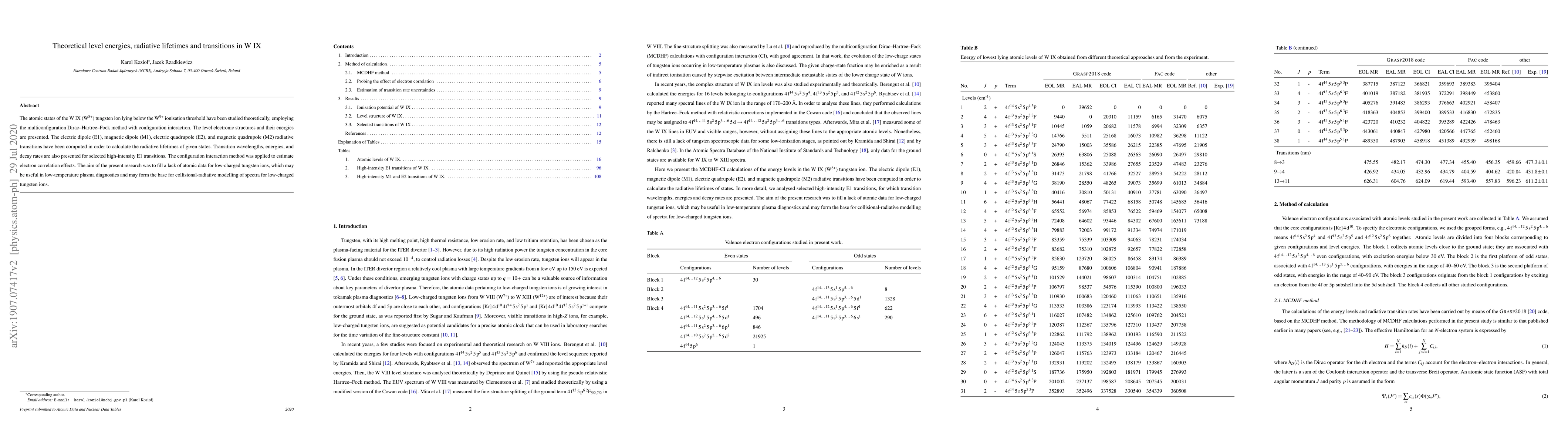 This paper theoretically investigates the atomic states of W IX (W8+) using the multiconfiguration Dirac-Hartree-Fock method, presenting electronic structures and energies. It computes radiative transitions and lifetimes, aiming to provide essential atomic data for low-temperature plasma diagnostics and collisional-radiative modelling.