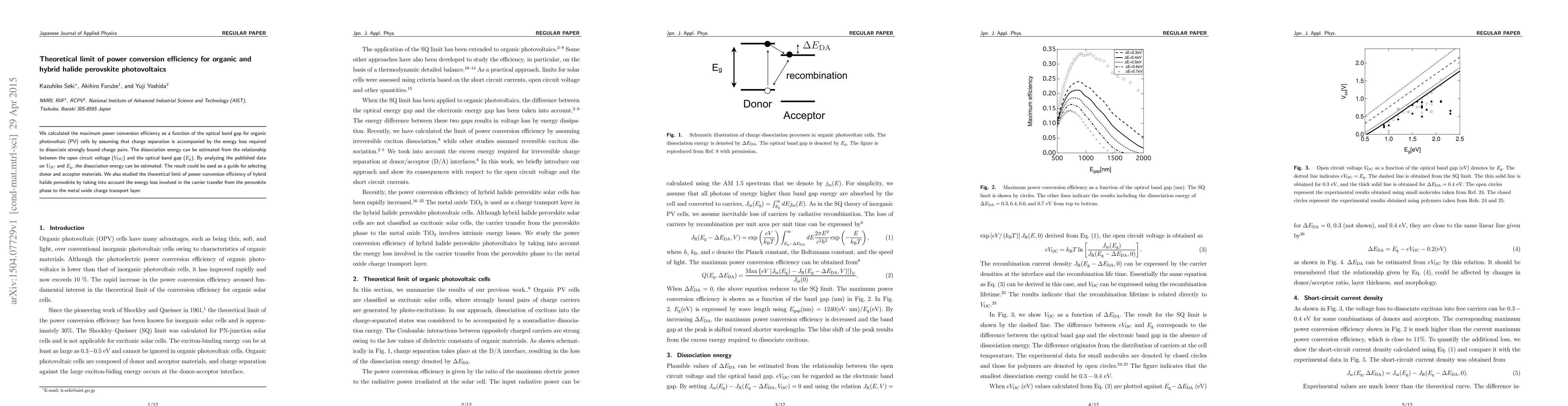 We calculated the maximum power conversion efficiency as a function of the optical band gap for organic photovoltaic (PV) cells by assuming that charge separation is accompanied by the energy loss required to dissociate strongly bound charge pairs. The dissociation energy can be estimated from the relationship between the open circuit voltage (VOC) and the optical band gap (Eg). By analyzing the published data on VOC and Eg, the dissociation energy can be estimated. The result could be used as a guide for selecting donor and acceptor materials. We also studied the theoretical limit of power conversion efficiency of hybrid halide perovskite by taking into account the energy loss involved in the carrier transfer from the perovskite phase to the metal oxide charge transport layer.