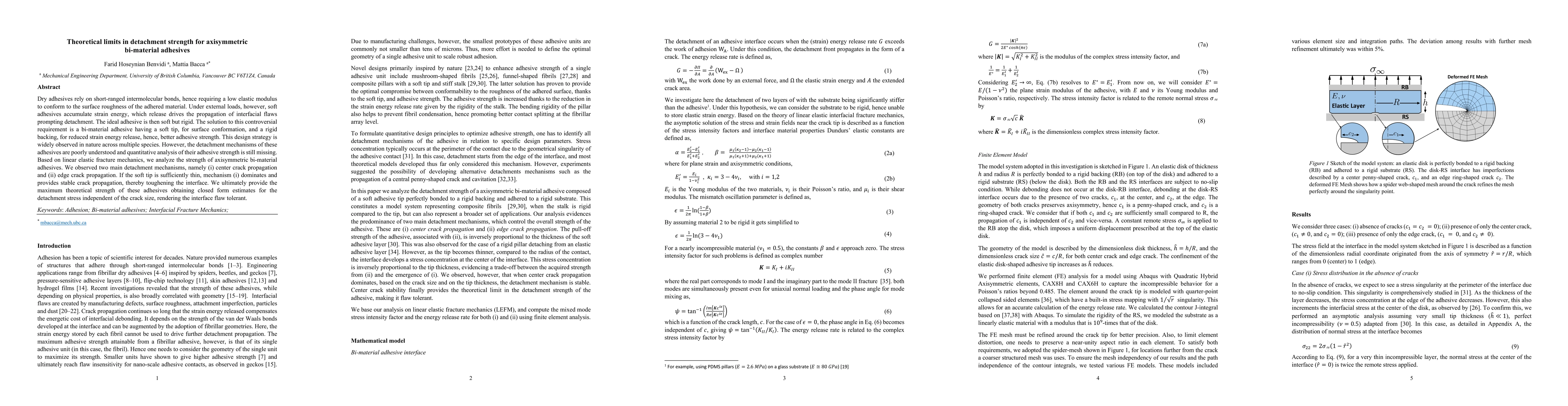 This paper investigates the theoretical limits of detachment strength in axisymmetric bi-material adhesives, identifying two main detachment mechanisms: center crack and edge crack propagation. It provides closed-form estimates for the maximum theoretical strength, revealing that a thin soft tip combined with a rigid backing can achieve stable crack propagation and enhance adhesive toughness.