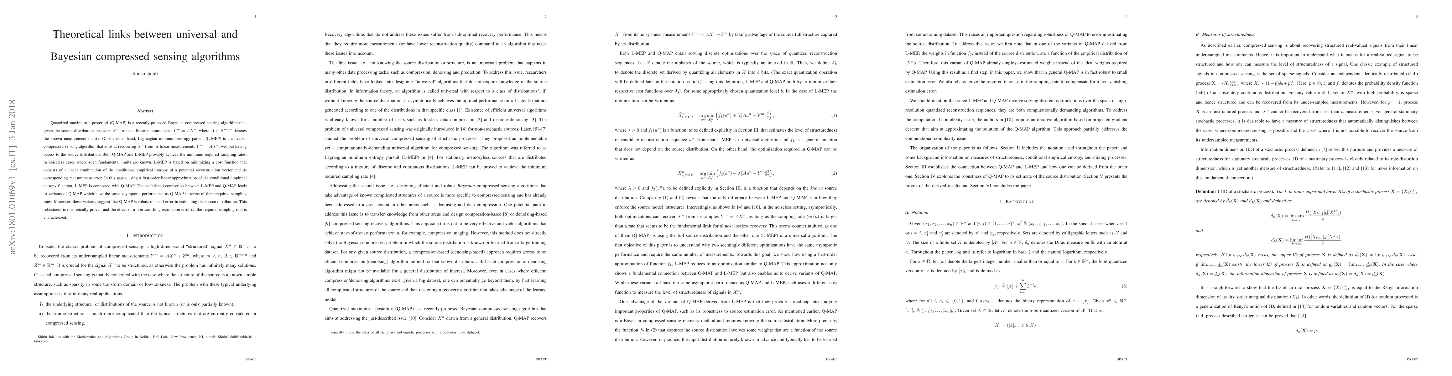 Researchers link universal compressed sensing algorithms Q-MAP and L-MEP to show how Q-MAP can achieve similar performance with fewer measurements, even when the source distribution is not accurately known.