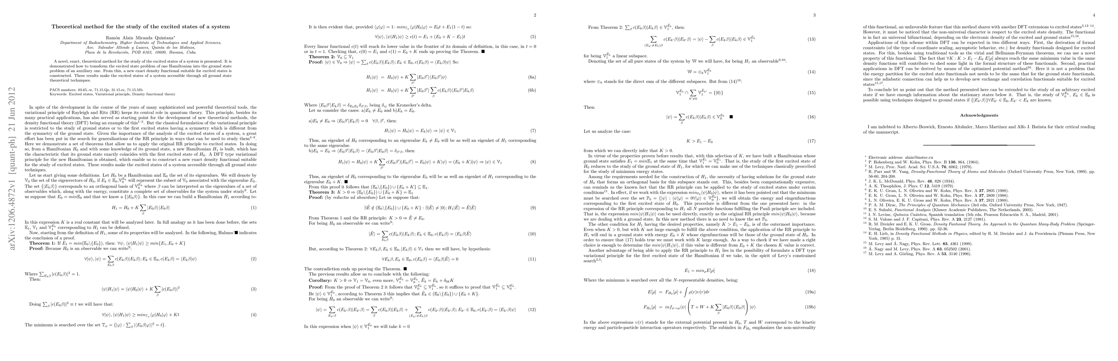 A novel, exact, theoretical method for the study of the excited states of a system is presented. It is demonstrated how to transform the excited state problem of one Hamiltonian into the ground state problem of an auxiliary one. From this, a new exact density functional suitable for excited states is constructed. These results make the excited states of a system accessible through all ground state theoretical techniques.