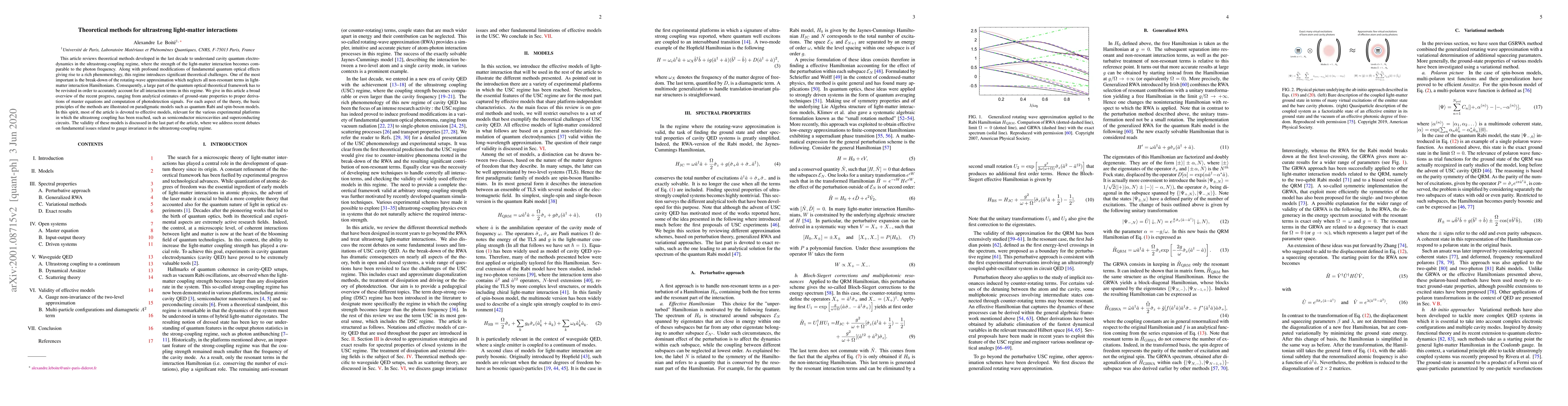 This article reviews theoretical methods developed in the last decade to understand cavity quantum electrodynamics in the ultrastrong-coupling regime, where the strength of the light-matter interaction becomes comparable to the photon frequency. Along with profound modifications of fundamental quantum optical effects giving rise to a rich phenomenology, this regime introduces significant theoretical challenges. One of the most important is the break-down of the rotating-wave approximation which neglects all non-resonant terms in light-matter interaction Hamiltonians. Consequently, a large part of the quantum optical theoretical framework has to be revisited in order to accurately account for all interaction terms in this regime. We give in this article a broad overview of the recent progress, ranging from analytical estimate of ground-state properties to proper derivations of master equations and computation of photodetection signals. For each aspect of the theory, the basic principles of the methods are illustrated on paradigmatic models such as quantum Rabi and spin-boson models. In this spirit, most of the article is devoted to effective models, relevant for the various experimental platforms in which the ultrastrong coupling has been reached, such as semiconductor microcavities and superconducting circuits. The validity of these models is discussed in the last part of the article, where we address recent debates on fundamental issues related to gauge invariance in the ultrastrong-coupling regime.