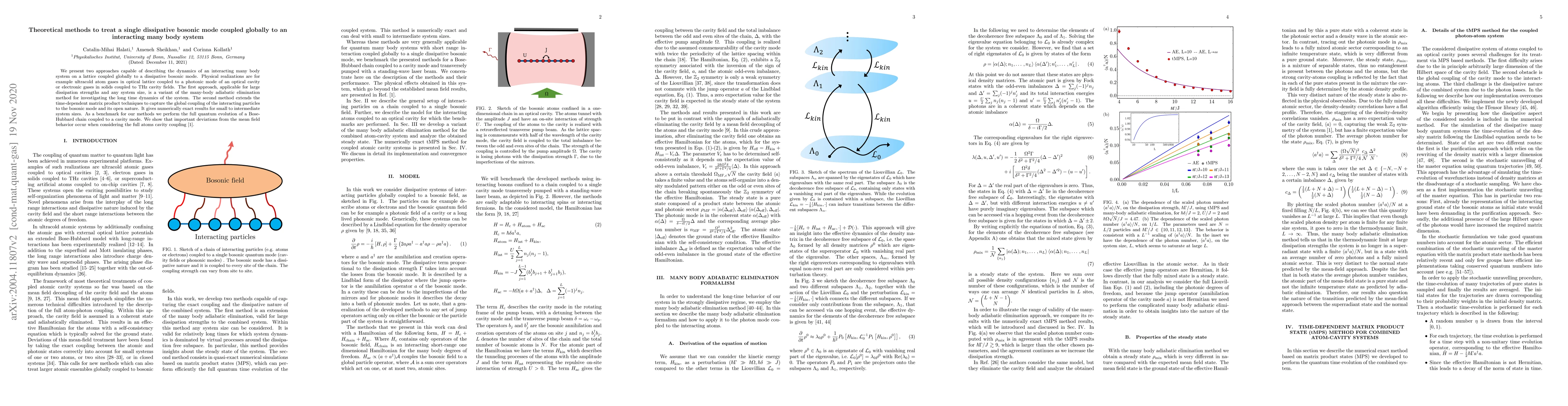 We present two approaches capable of describing the dynamics of an interacting many body system on a lattice coupled globally to a dissipative bosonic mode. Physical realizations are for example ultracold atom gases in optical lattice coupled to a photonic mode of an optical cavity or electronic gases in solids coupled to THz cavity fields. The first approach, applicable for large dissipation strengths and any system size, is a variant of the many-body adiabatic elimination method for investigating the long time dynamics of the system. The second method extends the time-dependent matrix product techniques to capture the global coupling of the interacting particles to the bosonic mode and its open nature. It gives numerically exact results for small to intermediate system sizes. As a benchmark for our methods we perform the full quantum evolution of a Bose-Hubbard chain coupled to a cavity mode. We show that important deviations from the mean-field behavior occur when considering the full atoms cavity coupling [1].