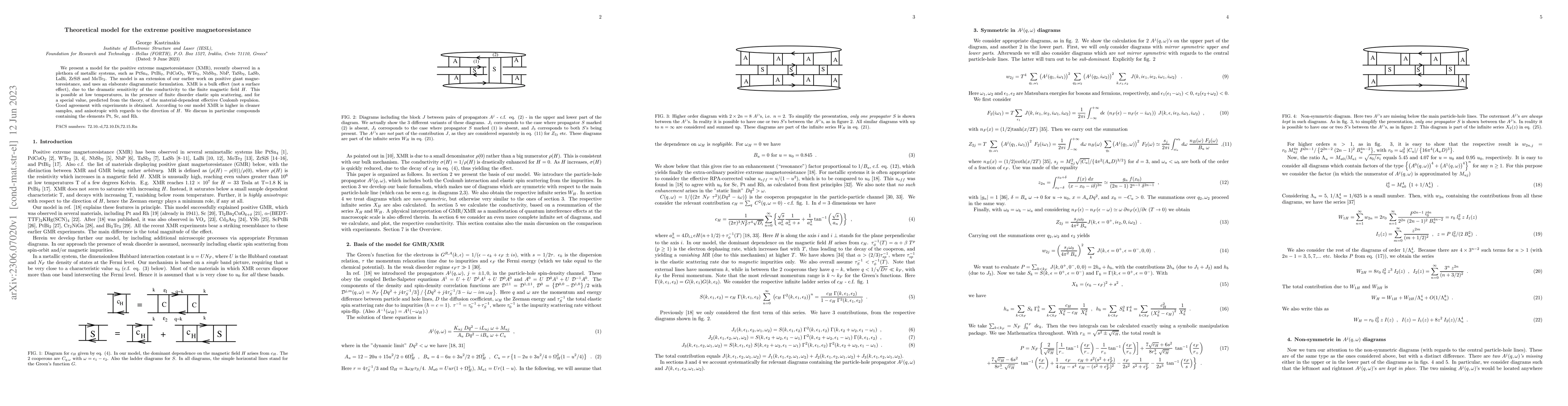 We present a model for the positive extreme magnetoresistance (XMR), recently observed in a plethora of metallic systems, such as PtSn$_4$, PtBi$_2$, PdCoO$_2$, WTe$_2$, NbSb$_2$, NbP, TaSb$_2$, LaSb, LaBi, ZrSiS and MoTe$_2$. The model is an extension of our earlier work on positive giant magnetoresistance, and uses an elaborate diagrammatic formulation. XMR is a bulk effect (not a surface effect), due to the dramatic sensitivity of the conductivity to the finite magnetic field $H$. This is possible at low temperatures, in the presence of finite disorder elastic spin scattering, and for a special value, predicted from the theory, of the material-dependent effective Coulomb repulsion. Good agreement with experiments is obtained. According to our model XMR is higher in cleaner samples, and anisotropic with regards to the direction of $H$. We discuss in particular compounds containing the elements Pt, Sc, and Rh.
