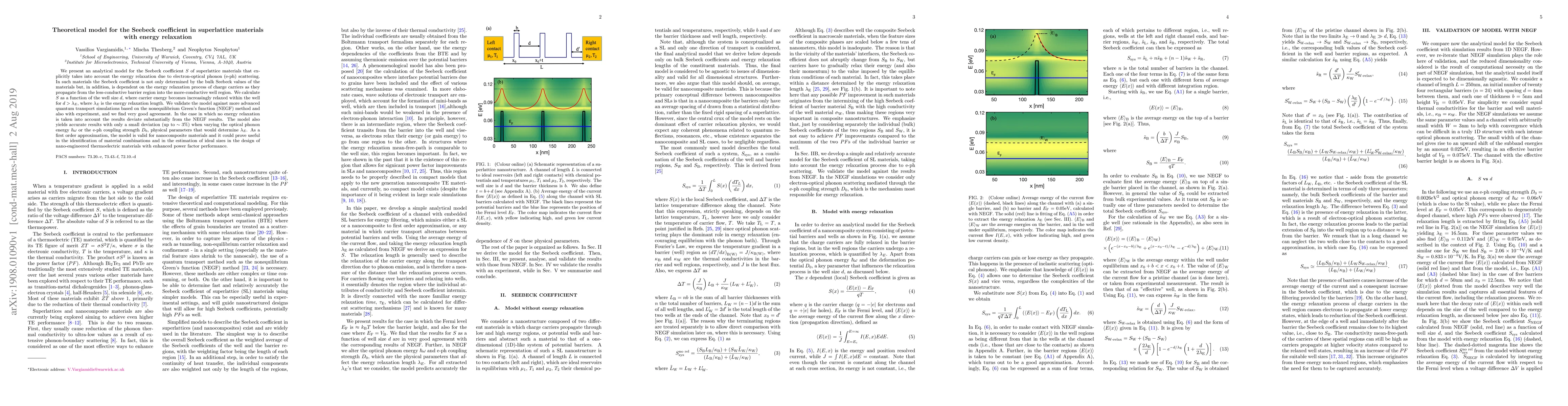 This paper presents an analytical model for the Seebeck coefficient in superlattice materials, emphasizing the role of electron-optical phonon scattering in energy relaxation. The model accurately predicts S as a function of well size, showing good agreement with quantum transport simulations and experimental data.
