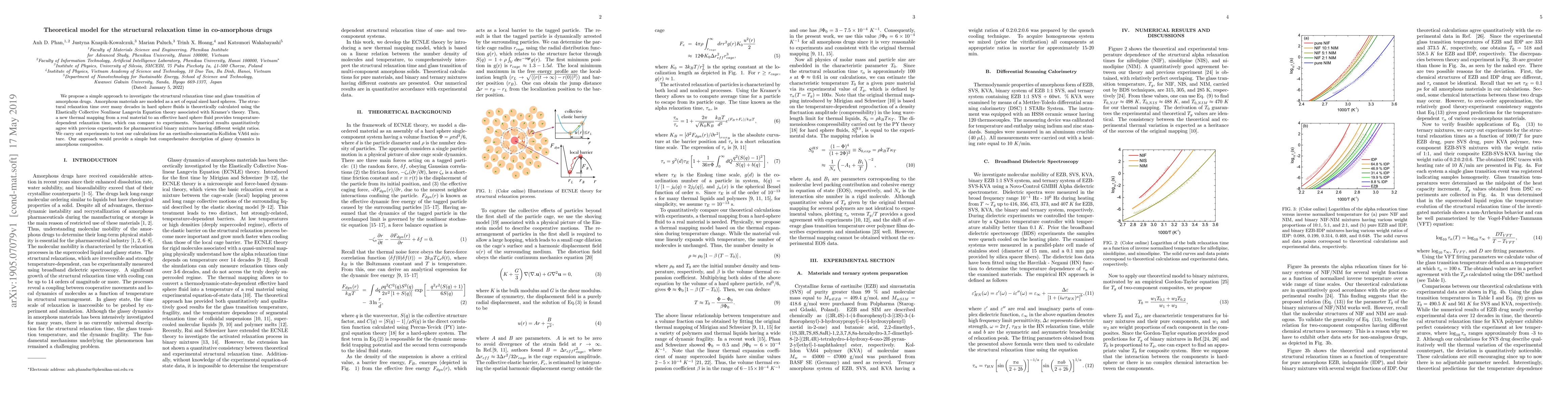 We propose a simple approach to investigate the structural relaxation time and glass transition of amorphous drugs. Amorphous materials are modeled as a set of equal sized hard spheres. The structural relaxation time over many decades in hard sphere fluids is theoretically calculated using the Elastically Collective Nonlinear Langevin Equation theory associated with Kramer's theory. Then, a new thermal mapping from a real material to an effective hard sphere fluid provides temperature-dependent relaxation time, which can compare to experiments. Numerical results quantitatively agree with previous experiments for pharmaceutical binary mixtures having different weight ratios. We carry out experiments to test our calculations for an ezetimibe-simvastatin-Kollidon VA64 mixture. Our approach would provide a simple but comprehensive description of glassy dynamics in amorphous composites.