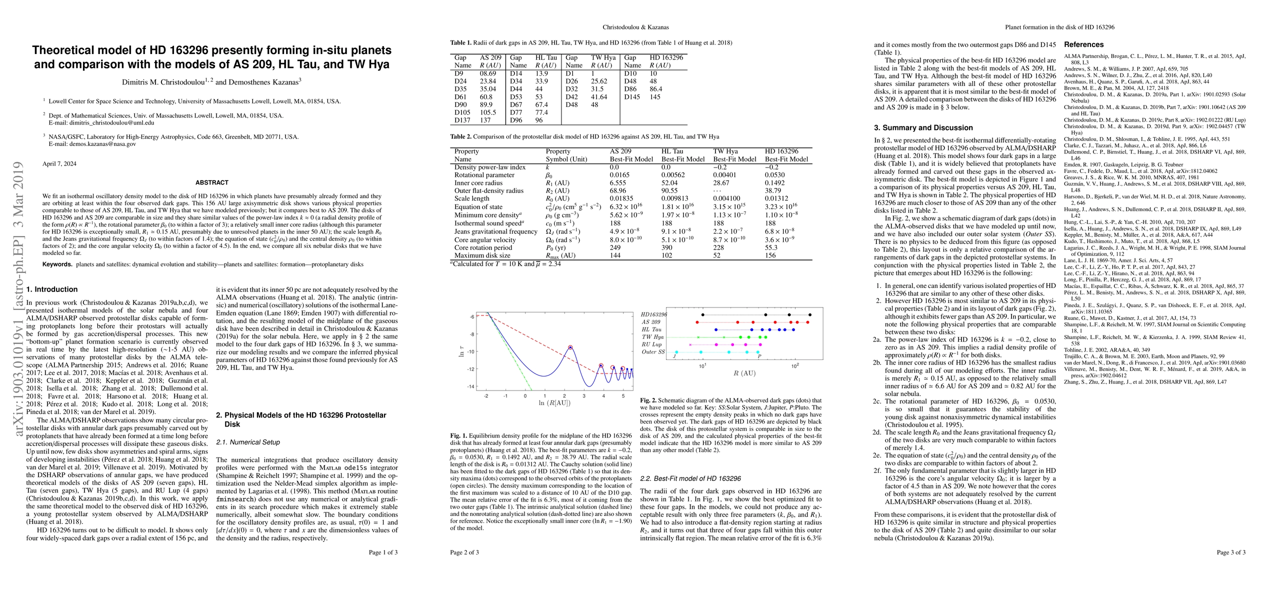 We fit an isothermal oscillatory density model to the disk of HD 163296 in which planets have presumably already formed and they are orbiting at least within the four observed dark gaps. This 156 AU large axisymmetric disk shows various physical properties comparable to those of AS 209, HL Tau, and TW Hya that we have modeled previously; but it compares best to AS 209. The disks of HD 163296 and AS 209 are comparable in size and they share similar values of the power-law index $k\approx 0$ (a radial density profile of the form $\rho(R)\propto R^{-1}$), the rotational parameter $\beta_0$ (to within a factor of 3); a relatively small inner core radius (although this parameter for HD 163296 is exceptionally small, $R_1\simeq 0.15$ AU, presumably due to unresolved planets in the inner 50 AU); the scale length $R_0$ and the Jeans gravitational frequency $\Omega_J$ (to within factors of 1.4); the equation of state ($c_0^2/\rho_0$) and the central density $\rho_0$ (to within factors of 2); and the core angular velocity $\Omega_0$ (to within a factor of 4.5). In the end, we compare all six nebular disks that we have modeled so far.