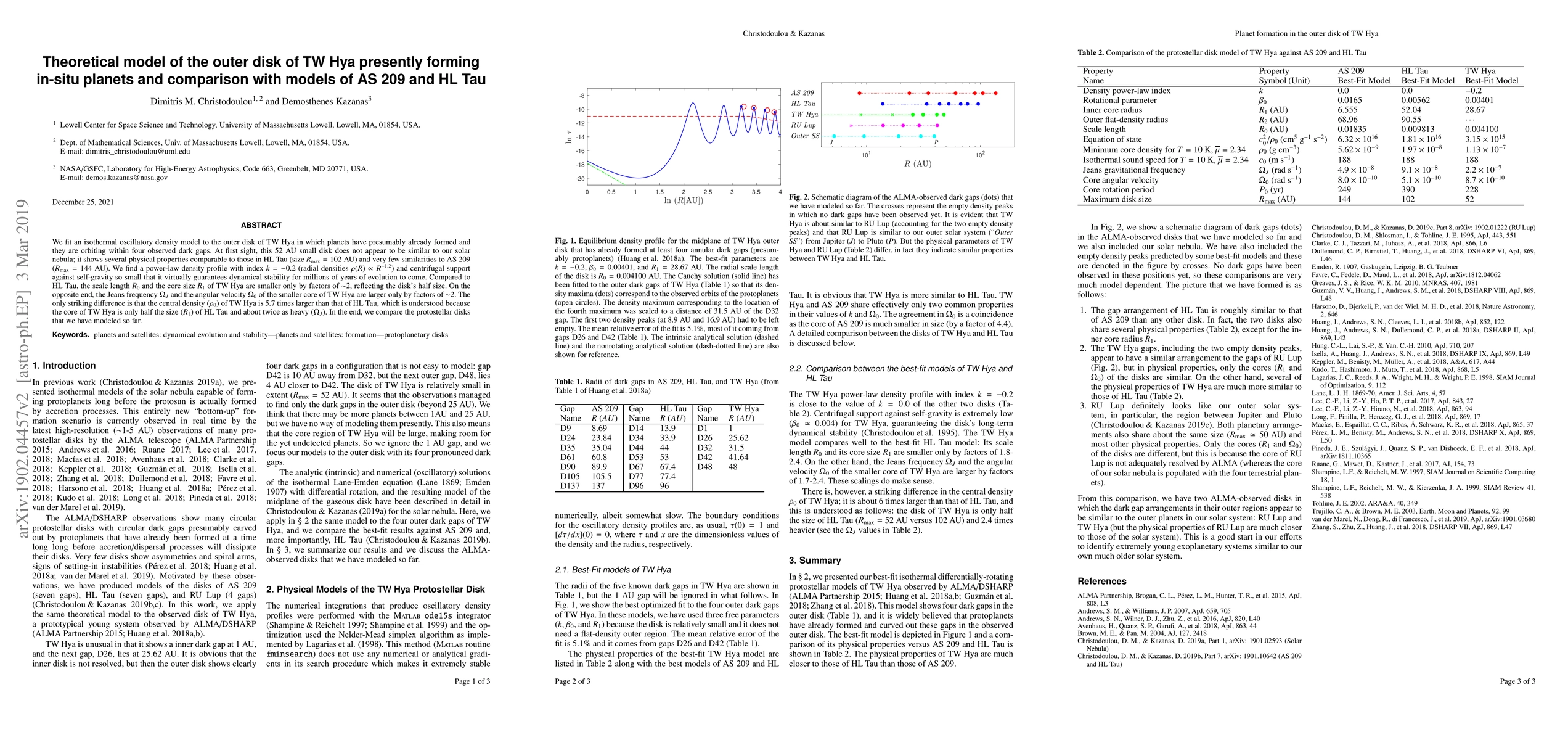 We fit an isothermal oscillatory density model to the outer disk of TW Hya in which planets have presumably already formed and they are orbiting within four observed dark gaps. At first sight, this 52 AU small disk does not appear to be similar to our solar nebula; it shows several physical properties comparable to those in HL Tau (size $R_{\rm max}=102$ AU) and very few similarities to AS 209 ($R_{\rm max}=144$ AU). We find a power-law density profile with index $k=-0.2$ (radial densities $\rho(R) \propto R^{-1.2}$) and centrifugal support against self-gravity so small that it virtually guarantees dynamical stability for millions of years of evolution to come. Compared to HL Tau, the scale length $R_0$ and the core size $R_1$ of TW Hya are smaller only by factors of $\sim$2, reflecting the disk's half size. On the opposite end, the Jeans frequency $\Omega_J$ and the angular velocity $\Omega_0$ of the smaller core of TW Hya are larger only by factors of $\sim$2. The only striking difference is that the central density ($\rho_0$) of TW Hya is 5.7 times larger than that of HL Tau, which is understood because the core of TW Hya is only half the size ($R_1$) of HL Tau and about twice as heavy ($\Omega_J$). In the end, we compare the protostellar disks that we have modeled so far.