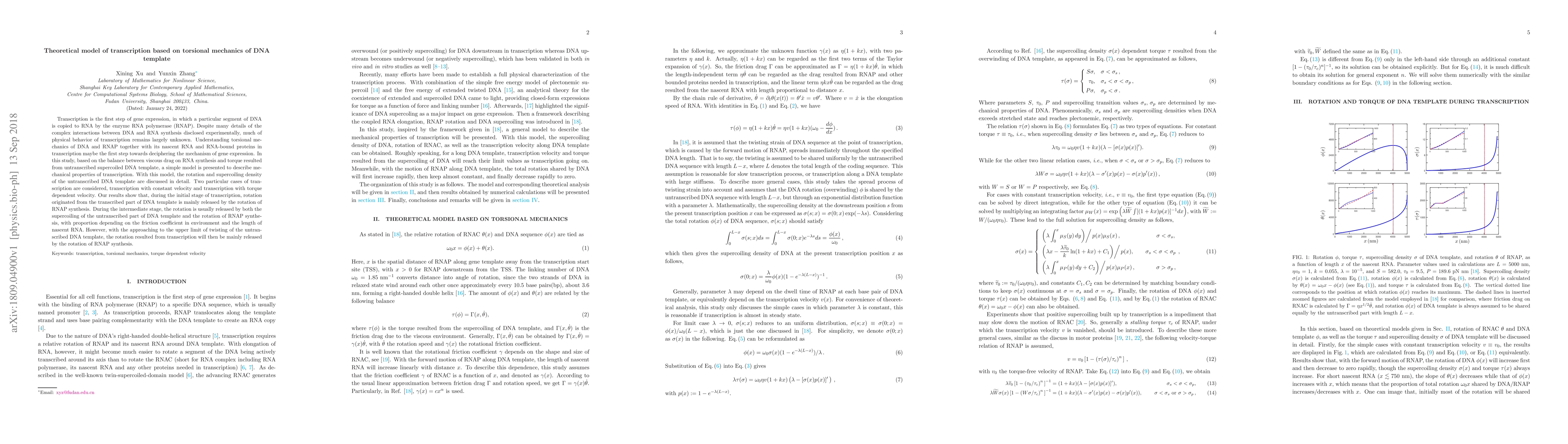 This paper presents a theoretical model to describe the torsional mechanics of transcription, focusing on the balance between viscous drag and torque from untranscribed supercoiled DNA. The model explores how rotation and supercoiling density of the untranscribed DNA template change during transcription, considering both constant velocity and torque-dependent velocity scenarios.