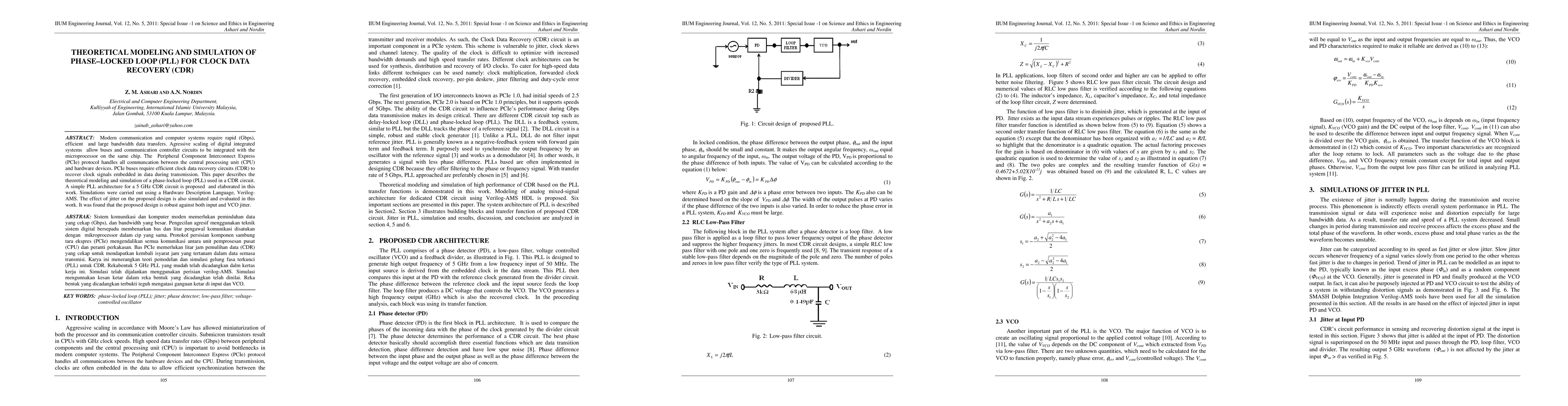 Modern communication and computer systems require rapid (Gbps), efficient and large bandwidth data transfers. Agressive scaling of digital integrated systems allow buses and communication controller circuits to be integrated with the microprocessor on the same chip. The Peripheral Component Interconnect Express (PCIe) protocol handles all communcation between the central processing unit (CPU) and hardware devices. PCIe buses require efficient clock data recovery circuits (CDR) to recover clock signals embedded in data during transmission. This paper describes the theoretical modeling and simulation of a phase-locked loop (PLL) used in a CDR circuit. A simple PLL architecture for a 5 GHz CDR circuit is proposed and elaborated in this work. Simulations were carried out using a Hardware Description Language, Verilog- AMS. The effect of jitter on the proposed design is also simulated and evaluated in this work. It was found that the proposed design is robust against both input and VCO jitter.