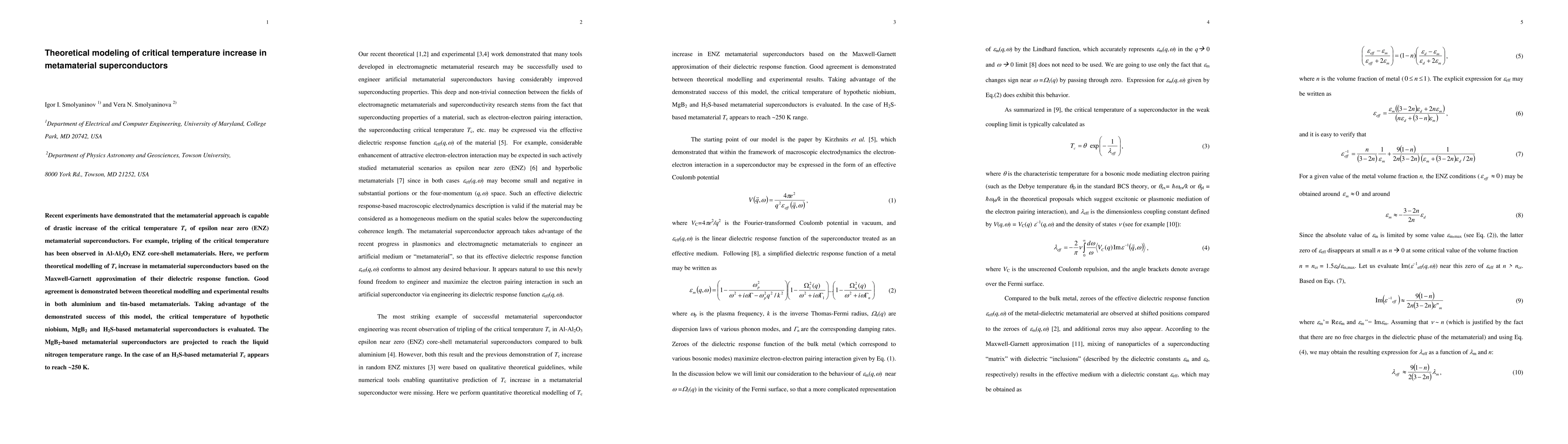 Researchers developed a theoretical model to predict the increase in critical temperature of metamaterial superconductors, achieving good agreement with experimental results for aluminum and tin-based materials. The model also predicts potential temperatures for niobium, MgB2, and H2S-based metamaterials, including reaching liquid nitrogen temperatures.