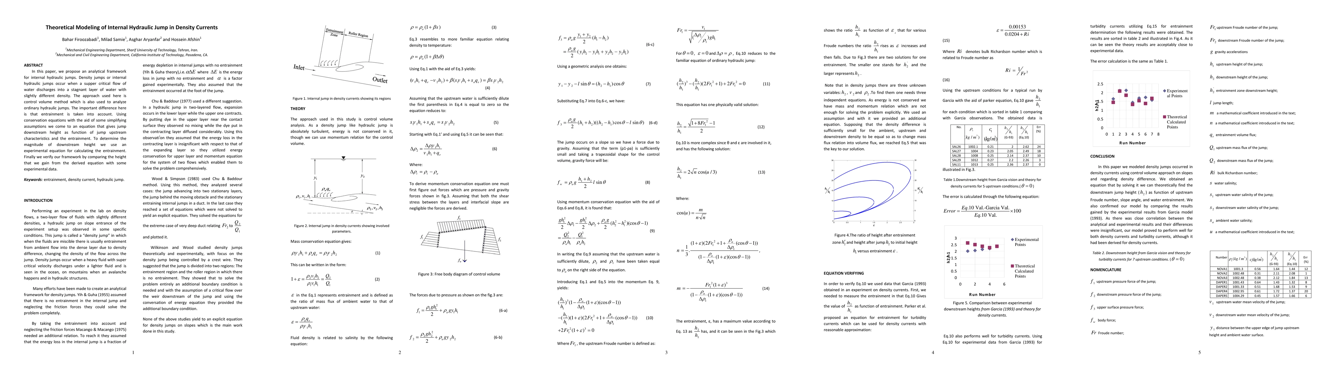 In this paper, we propose an analytical framework for internal hydraulic jumps. Density jumps or internal hydraulic jumps occur when a supper critical flow of water discharges into a stagnant layer of water with slightly different density. The approach used here is control volume method which is also used to analyze ordinary hydraulic jumps. The important difference here is that entrainment is taken into account. Using conservation equations with the aid of some simplifying assumptions we come to an equation that gives jump downstream height as function of jump upstream characteristics and the entrainment. To determine the magnitude of downstream height we use an experimental equation for calculating the entrainment. Finally we verify our framework by comparing the height that we gain from the derived equation with some experimental data.