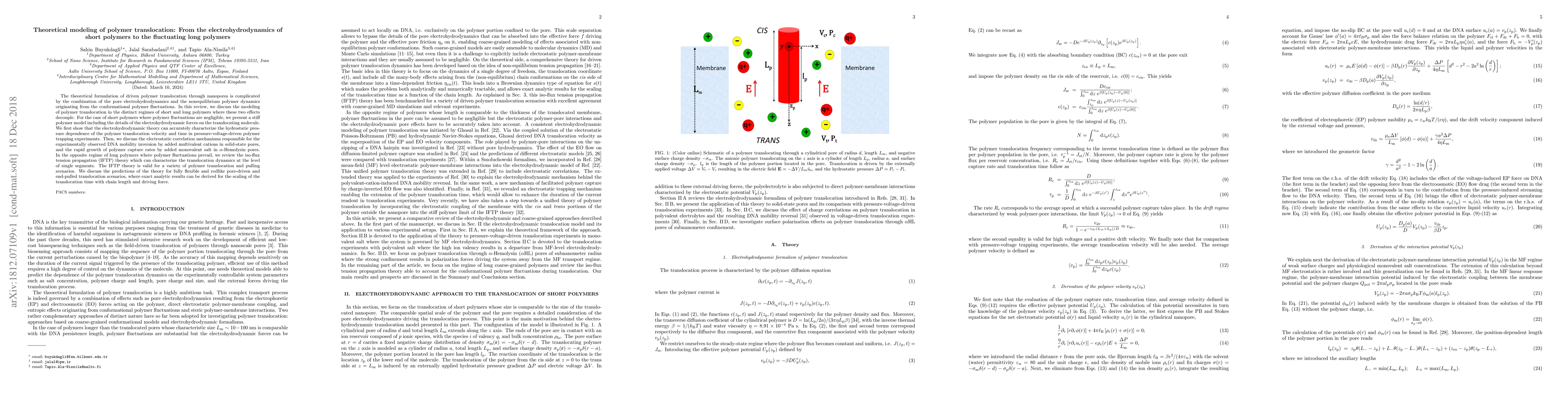 This paper reviews theoretical models for polymer translocation through nanopores, distinguishing between short and long polymers. For short polymers, it presents a stiff polymer model incorporating electrohydrodynamics to explain polymer dynamics and pressure-voltage experiments. For long polymers, it discusses the iso-flux tension propagation theory to characterize dynamics at the segment level, providing analytic results for scaling of translocation time with chain length and driving force.