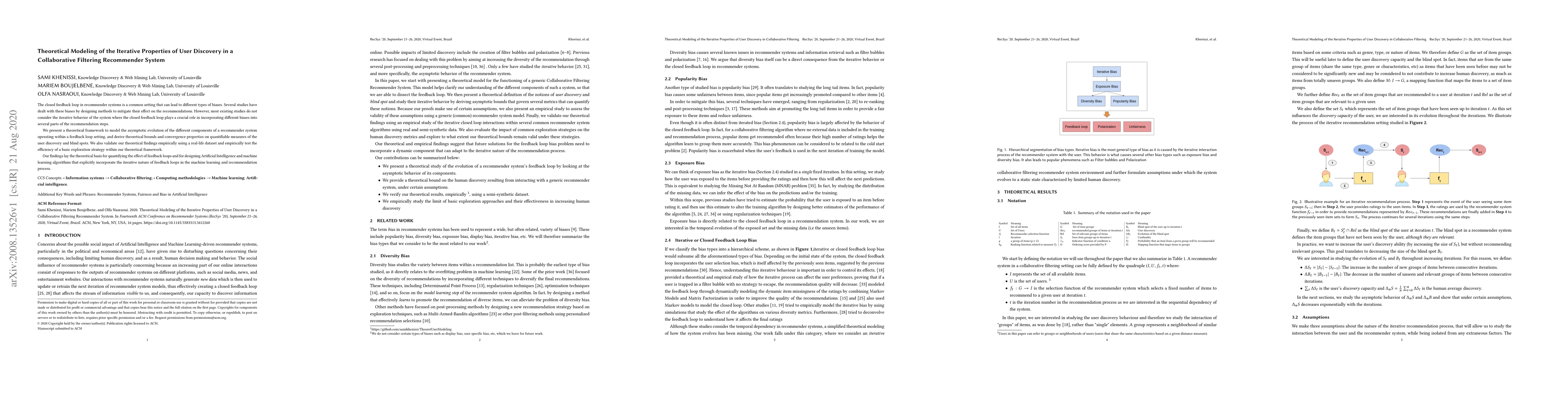 The closed feedback loop in recommender systems is a common setting that can lead to different types of biases. Several studies have dealt with these biases by designing methods to mitigate their effect on the recommendations. However, most existing studies do not consider the iterative behavior of the system where the closed feedback loop plays a crucial role in incorporating different biases into several parts of the recommendation steps. We present a theoretical framework to model the asymptotic evolution of the different components of a recommender system operating within a feedback loop setting, and derive theoretical bounds and convergence properties on quantifiable measures of the user discovery and blind spots. We also validate our theoretical findings empirically using a real-life dataset and empirically test the efficiency of a basic exploration strategy within our theoretical framework. Our findings lay the theoretical basis for quantifying the effect of feedback loops and for designing Artificial Intelligence and machine learning algorithms that explicitly incorporate the iterative nature of feedback loops in the machine learning and recommendation process.