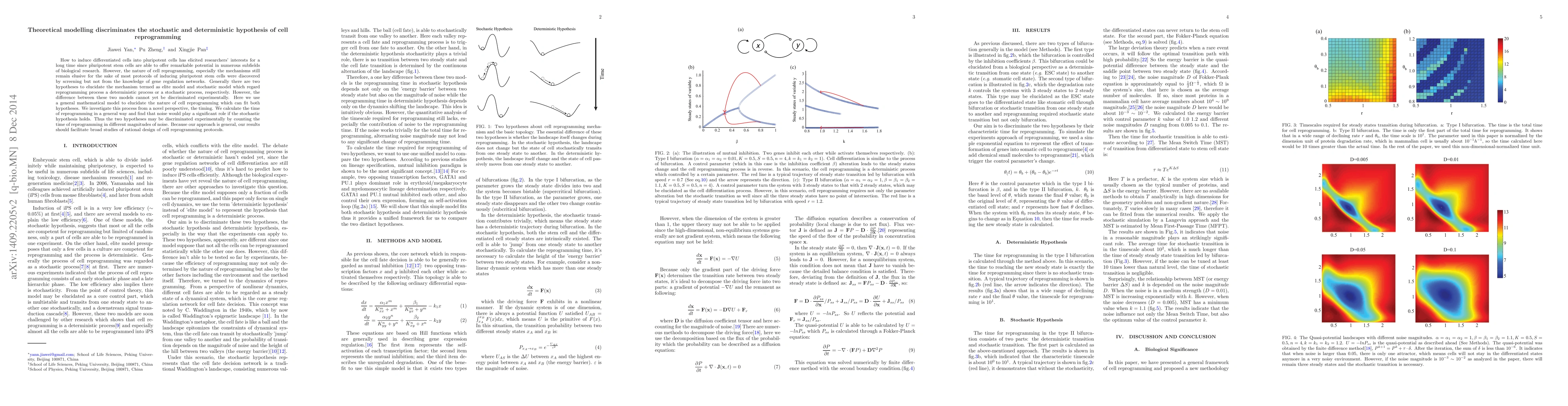 This paper proposes a theoretical mathematical model to distinguish between the deterministic elite model and the stochastic model of cell reprogramming. It suggests that the timing of reprogramming, influenced by noise, can help discriminate between these hypotheses, potentially guiding the design of new cell reprogramming protocols.