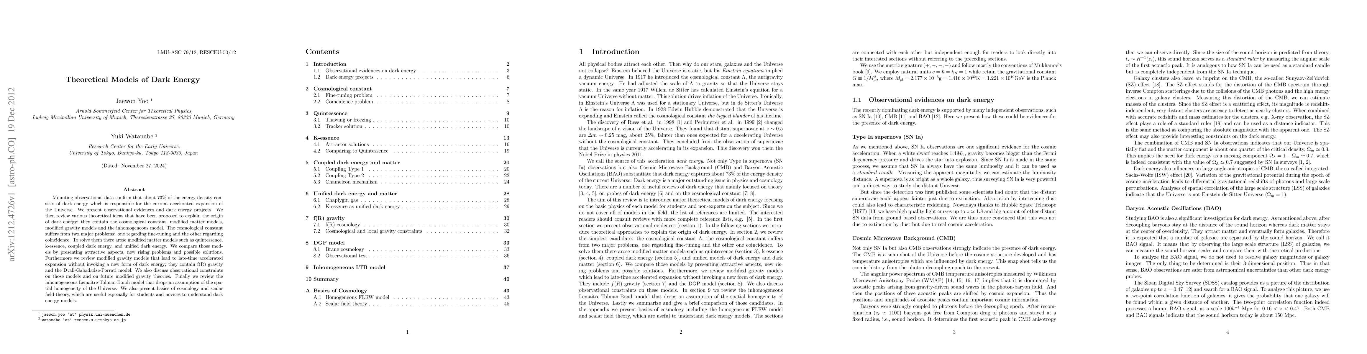 Mounting observational data confirm that about 73% of the energy density consists of dark energy which is responsible for the current accelerated expansion of the Universe. We present observational evidences and dark energy projects. We then review various theoretical ideas that have been proposed to explain the origin of dark energy; they contain the cosmological constant, modified matter models, modified gravity models and the inhomogeneous model. The cosmological constant suffers from two major problems: one regarding fine-tuning and the other regarding coincidence. To solve them there arose modified matter models such as quintessence, k-essence, coupled dark energy, and unified dark energy. We compare those models by presenting attractive aspects, new rising problems and possible solutions. Furthermore we review modified gravity models that lead to late-time accelerated expansion without invoking a new form of dark energy; they contain f(R) gravity and the Dvali-Gabadadze-Porrati model. We also discuss observational constraints on those models and on future modified gravity theories. Finally we review the inhomogeneous Lemaitre-Tolman-Bondi model that drops an assumption of the spatial homogeneity of the Universe. We also present basics of cosmology and scalar field theory, which are useful especially for students and novices to understand dark energy models.