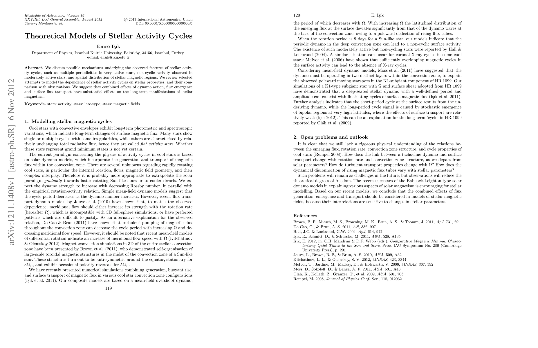 This paper explores mechanisms behind stellar activity cycles, including multiple periodicities and non-cyclic activity, and reviews models linking these phenomena to stellar properties. The authors propose that dynamo action, flux emergence, and surface flux transport significantly influence stellar magnetic behavior.