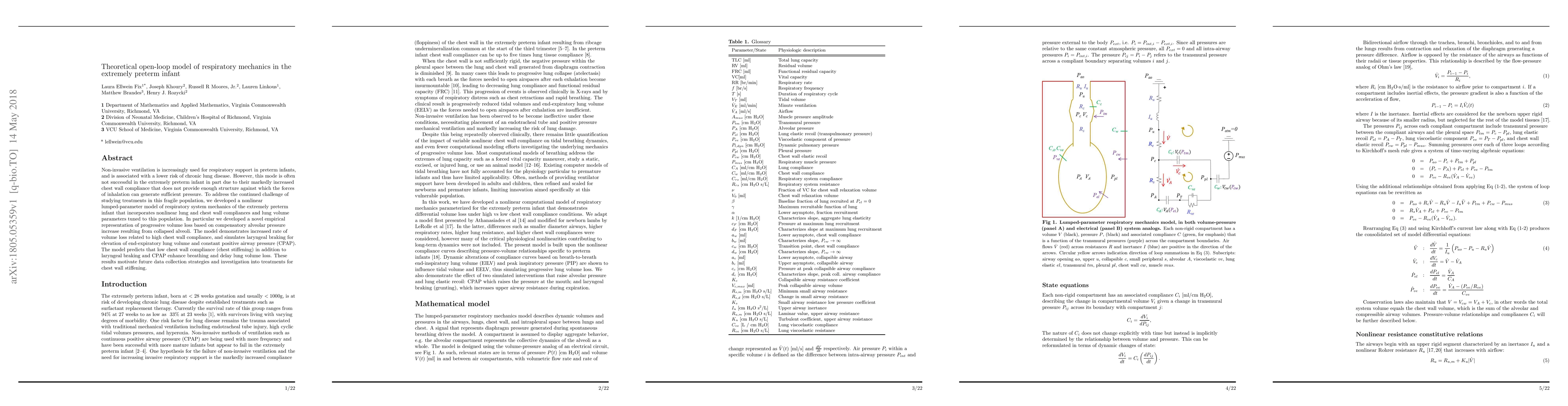 This paper develops a theoretical open-loop model to study respiratory mechanics in extremely preterm infants, focusing on the challenges of non-invasive ventilation due to high chest wall compliance. The model predicts that interventions like laryngeal braking and CPAP, combined with chest wall stiffening, can enhance breathing and delay lung volume loss, guiding future research on treatment strategies.