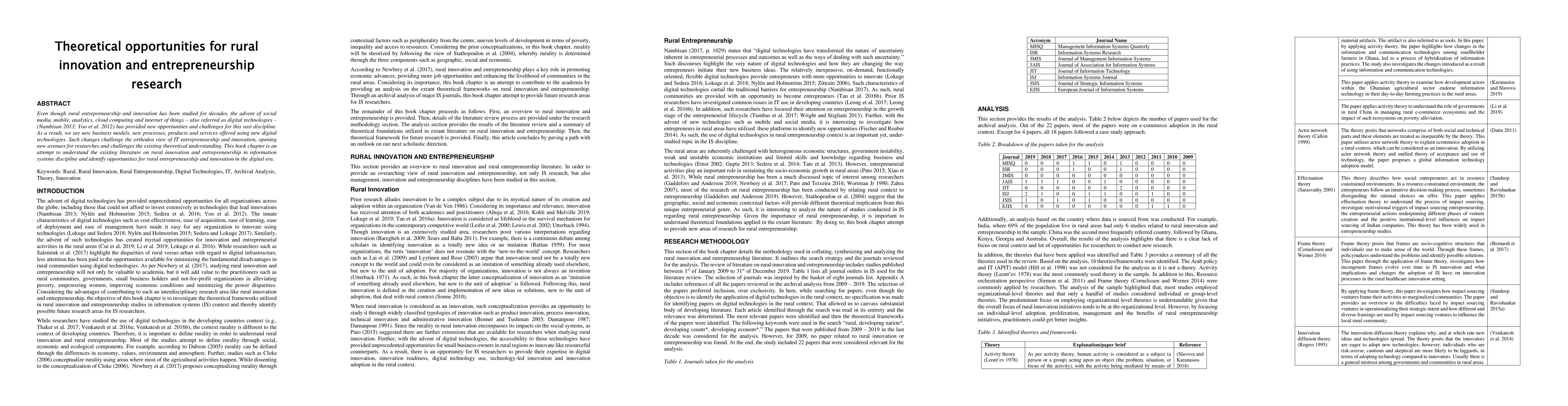 Even though rural entrepreneurship and innovation has been studied for decades, the advent of social media, mobile, analytics, cloud computing and internet of things - also referred as digital technologies - (Nambisan 2013, Yoo et al. 2012) has provided new opportunities and challenges for this vast discipline. As a result, we see new business models, new processes, products and services offered using new digital technologies. Such changes challenge the orthodox view of IT entrepreneurship and innovation, opening new avenues for researches and challenges the existing theoretical understanding. This book chapter is an attempt to understand the existing literature on rural innovation and entrepreneurship in information systems discipline and identify opportunities for rural entrepreneurship and innovation in the digital era.