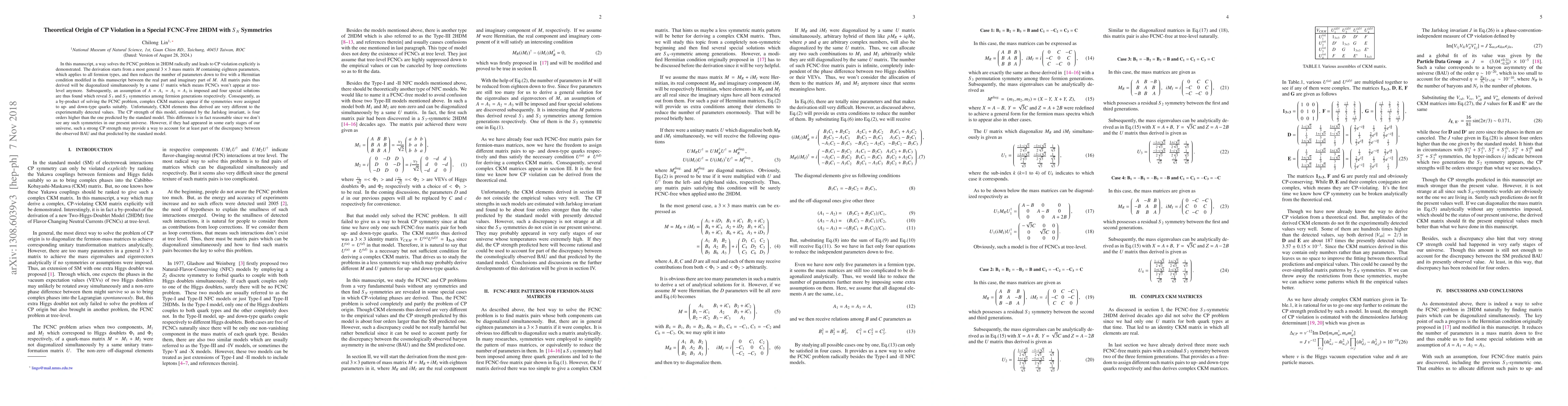 In this manuscript, a way solves the FCNC problem in 2HDM radically and leads to CP violation explicitly is demonstrated. The derivation starts from a most general $3 \times 3$ mass matrix $M$ containing eighteen parameters, which applies to all fermion types, and then reduces the number of parameters down to five with a Hermitian condition modified in this manuscript between the real part and imaginary part of $M$. All matrix pairs thus derived will be diagonalized simultaneously by a same $U$ matrix which means FCNCs won't appear at tree-level anymore. Subsequently, an assumption of $A=A_1=A_2=A_3$ is imposed and four special solutions are thus found which reveal $S_3$ and $S_2$ symmetries among fermion generations respectively. Consequently, as a by-product of solving the FCNC problem, complex CKM matrices appear if the symmetries were assigned to up- and down-type quarks suitably. Unfortunately, CKM elements thus derived are very different to the experimentally detected values. The CP strength of this model, estimated by the Jarlskog invariant, is four orders higher than the one predicted by the standard model. This difference is in fact reasonable since we don't see any such symmetries in our present universe. However, if they had appeared in some early stages of our universe, such a strong CP strength may provide a way to account for at least part of the discrepancy between the observed BAU and that predicted by the standard model.