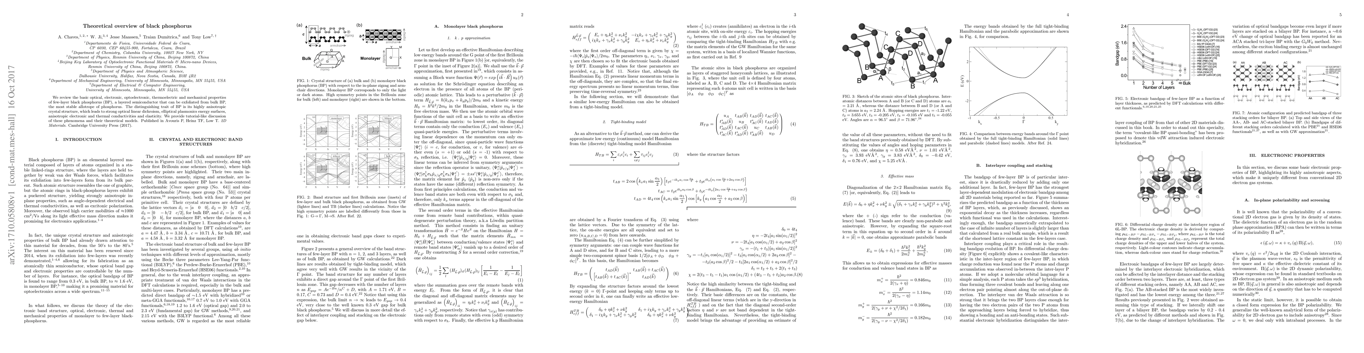 This paper offers a comprehensive overview of the optical, electronic, optoelectronic, thermoelectric, and mechanical properties of few-layer black phosphorus, highlighting its unique anisotropic crystal structure and associated phenomena such as optical linear dichroism and anisotropic conductivities. The paper provides theoretical models to explain these properties.