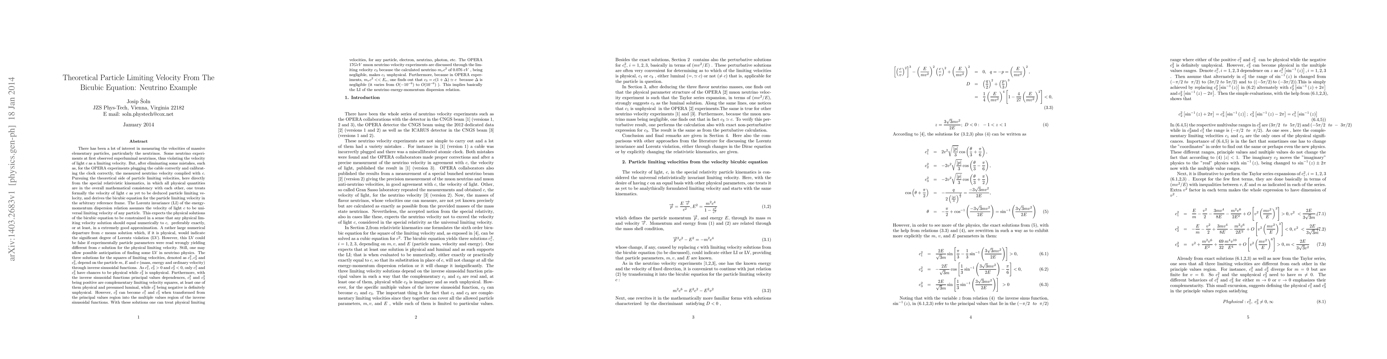 There has been a lot of interest in measuring the velocities of massive elementary particles, particularly the neutrinos. Some neutrino experi- ments at first observed superluminal neutrinos, thus violating the velocity of light c as a limiting velocity. But, after eliminating some mistakes, such as, for the OPERA experiments plugging the cable correctly and calibrat- ing the clock correctly, the measured neutrino velocity complied with c. Pursuing the theoretical side of particle limiting velocities, here directly from the special relativistic kinematics, in which all physical quantities are in the overall mathematical consistency with each other, one treats formally the velocity of light c as yet to be deduced particle limiting ve- locity, and derives the bicubic equation for the particle limiting velocity in the arbitrary reference frame.