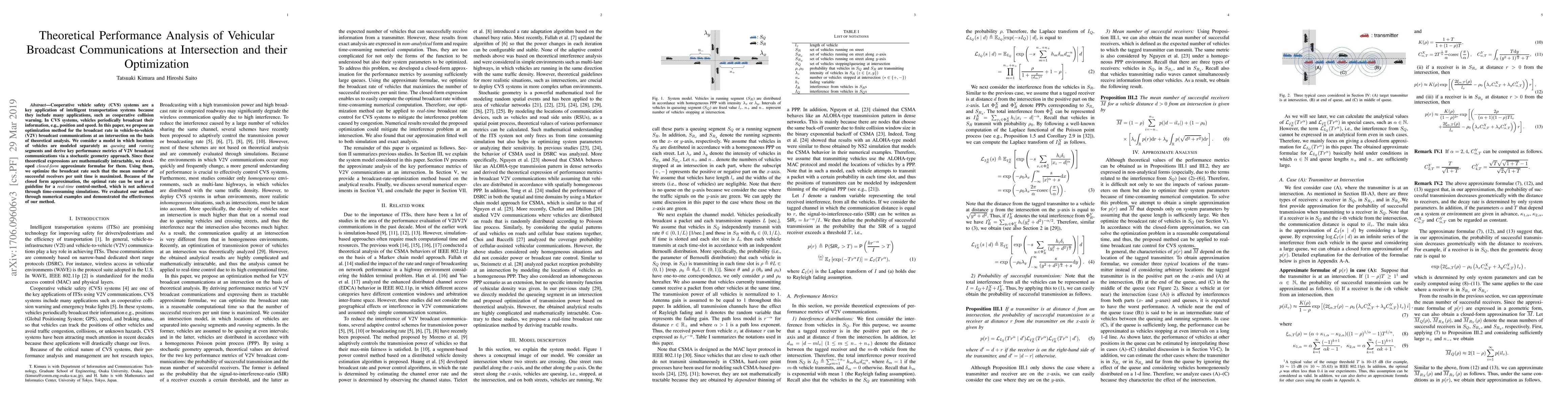 This paper proposes an optimization method for vehicle-to-vehicle broadcast communications at intersections, using theoretical analysis and stochastic geometry. It develops closed-form approximations for performance metrics and optimizes the broadcast rate to maximize successful receivers, providing a real-time control guideline.