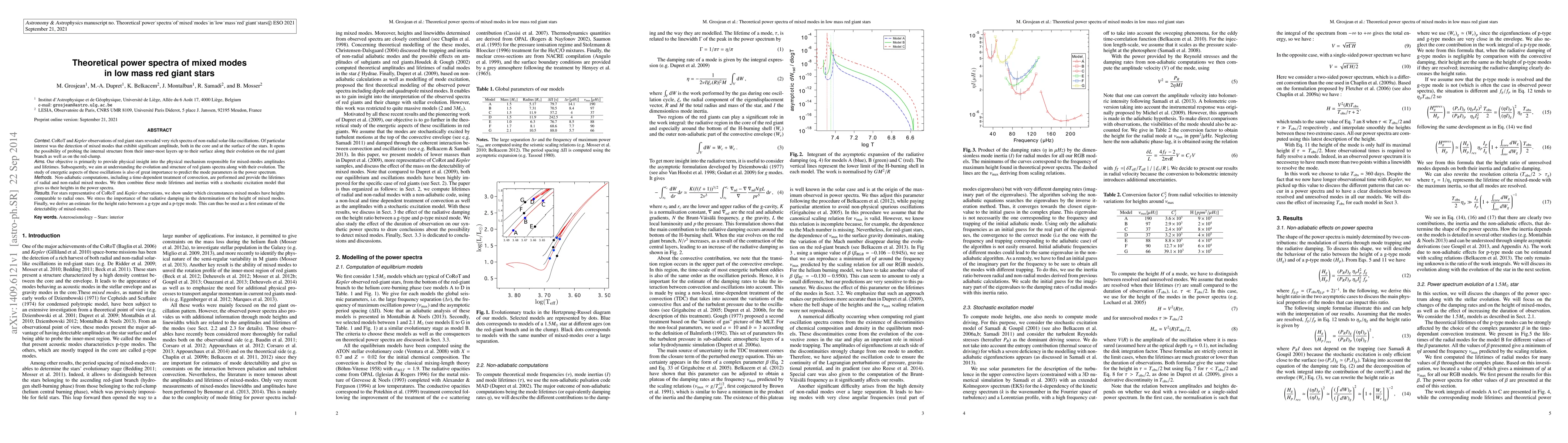 This paper investigates the theoretical power spectra of mixed modes in low mass red giant stars, using CoRoT and Kepler observations to understand the physical mechanisms behind their amplitudes and lifetimes. It combines non-adiabatic computations with stochastic excitation models to predict mode parameters, highlighting the importance of radiative damping and providing estimates for the detectability of mixed modes in the power spectrum.