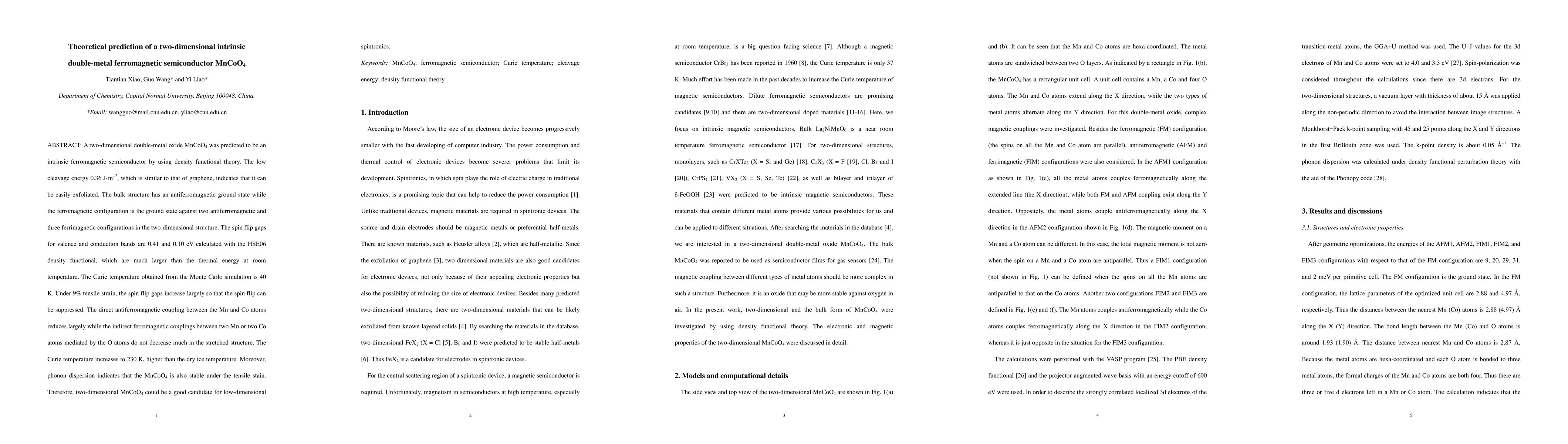 This paper predicts that two-dimensional MnCoO4 is an intrinsic ferromagnetic semiconductor with a high Curie temperature of 230 K under tensile strain, making it a promising material for low-dimensional spintronics applications. The material's stability and large spin flip gaps ensure its potential for practical use.