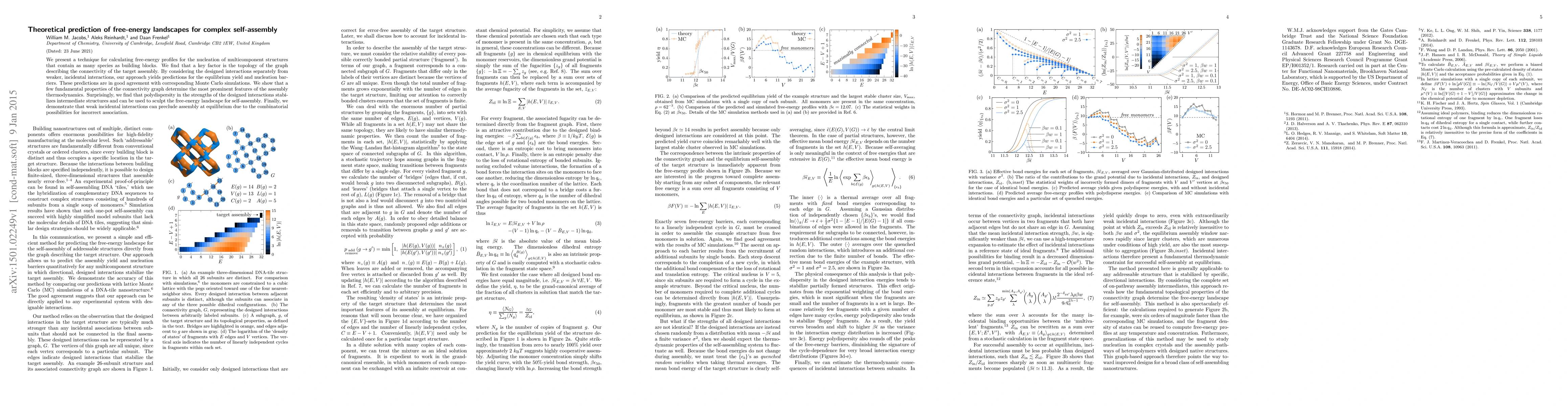 This paper introduces a method for predicting free-energy landscapes in multicomponent self-assembly, emphasizing the role of assembly connectivity graph topology. The technique separates designed interactions from incidental ones, yielding accurate equilibrium yield and nucleation barrier predictions that align with Monte Carlo simulations.
