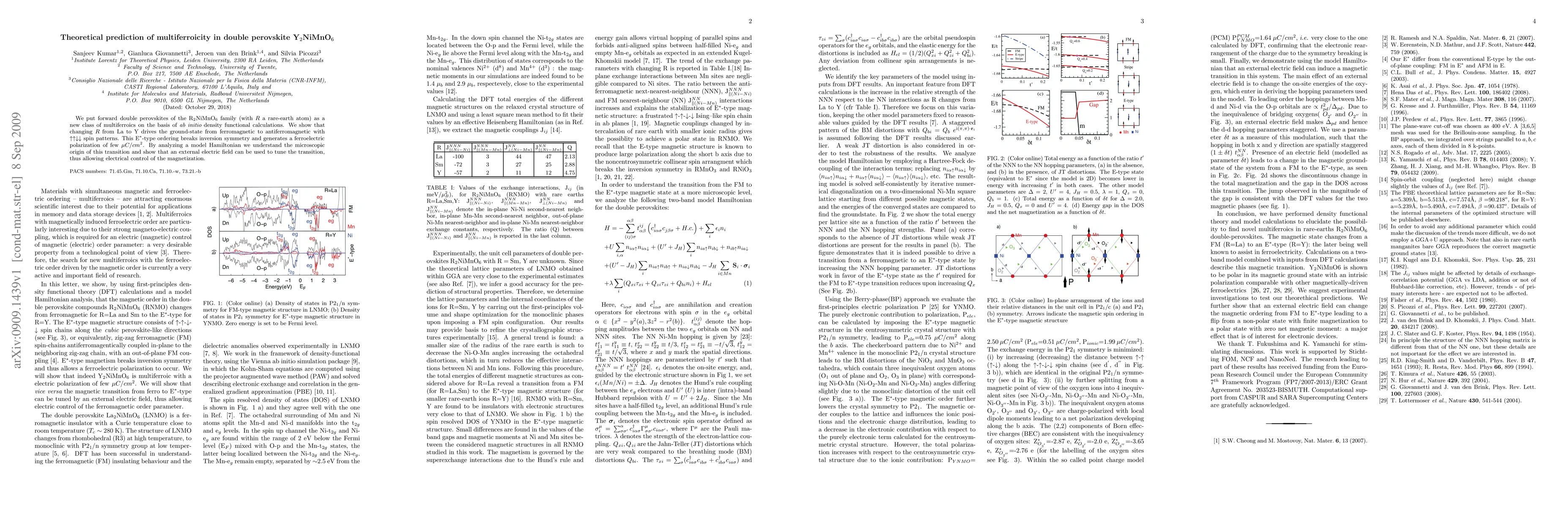 This paper predicts that Y$_2$NiMnO$_6$ is a new multiferroic material based on {\it ab initio} calculations. The study reveals that changing the rare-earth element from La to Y induces a transition from ferromagnetic to antiferromagnetic spin ordering, which generates ferroelectric polarization and allows electrical control of magnetization.