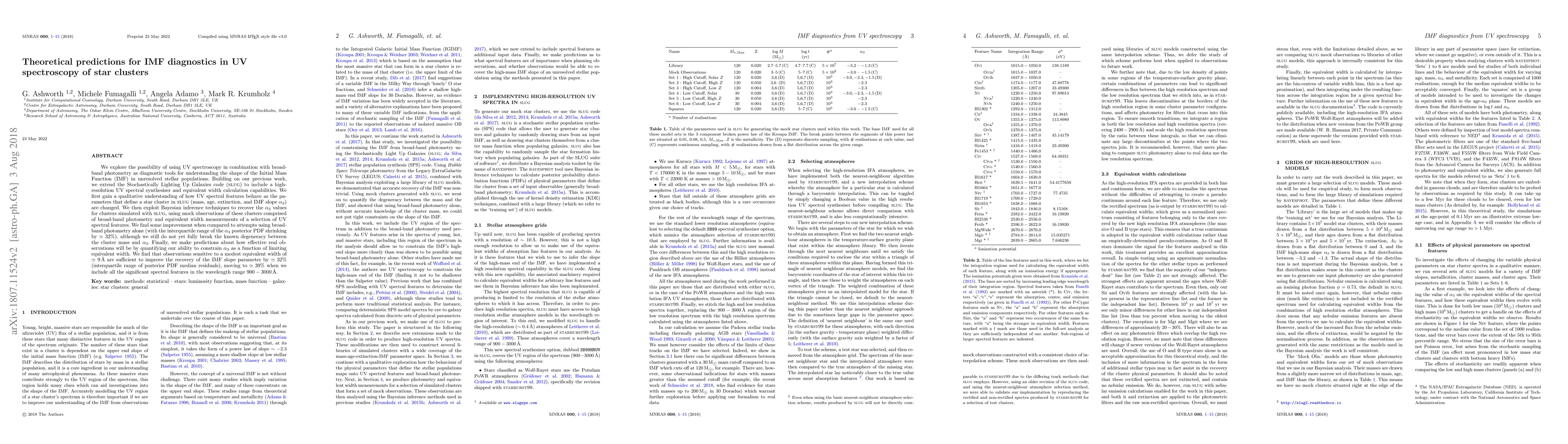 We explore the possibility of using UV spectroscopy in combination with broad-band photometry as diagnostic tools for understanding the shape of the Initial Mass Function (IMF) in unresolved stellar populations. Building on our previous work, we extend the Stochastically Lighting Up Galaxies code (slug) to include a high-resolution UV spectral synthesiser and equivalent width calculation capabilities. We first gain a qualitative understanding of how UV spectral features behave as the parameters that define a star cluster in slug (mass, age, extinction, and IMF slope alpha) are changed. We then exploit Bayesian inference techniques to recover the alpha values for clusters simulated with slug, using mock observations of these clusters comprised of broad-band photometry and equivalent width measurements of a selection of UV spectral features. We find some improvement when compared to attempts using broad-band photometry alone (with the interquartile range of the alpha posterior PDF shrinking by 32%), although we still do not yet fully break the known degeneracy between the cluster mass and alpha. Finally, we make predictions about how effective real observations will be by quantifying our ability to constrain alpha as a function of limiting equivalent width. We find that observations sensitive to a modest equivalent width of 9 A are sufficient to improve the recovery of the IMF slope parameter by 32% (interquartile range of posterior PDF median residuals), moving to 39% when we include all the significant spectral features in the wavelength range 900-3000 A.